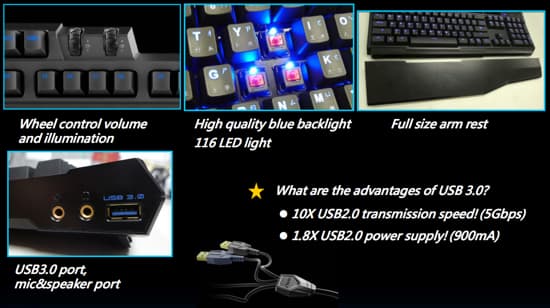 Отличительной чертой Osmium является подключение через USB 3.0 и наличие разъема соответствующей версии на самом устройстве. Клавиатура основана на уже зарекомендовавших себя механических клавишах Cherry Red, имеет пять кнопок макросов и распознает одновременное нажатие множества клавиш. Яркость синей подсветки контролируется при помощи колесика.
