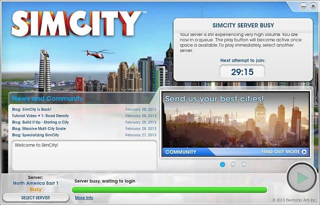 Второй март подряд на Electronic Arts обрушивается шквал критики (напоминаем про прошлогодний скандал вокруг концовки Mass Effect 3). В первые дни после выхода SimCity люди не могли зайти на серверы, чтобы спокойно заняться строительством городов. Разработчики были вынуждены отключить ряд социальных функций, чтобы хоть как-то разобраться с проблемой, хотя наличие отдельного режима для игры в оффлайне заметно снизило бы накал негодования. Авторы этого не предусмотрели, аргументируя тем, что новый градостроительный симулятор содержит элементы массовой онлайновой игры. Зато обычный пользователь сделал модификацию, позволяющую играть в оффлайне, за что ему большое спасибо.