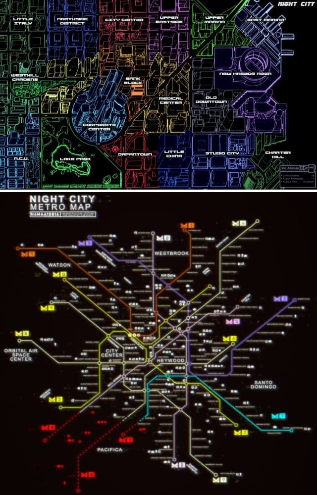 Карта Night City в Cyberpunk 2020 и карта метро в Cyberpunk 2077
