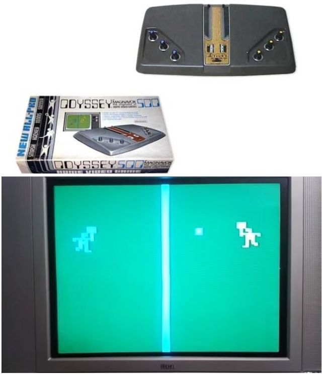 Здесь впервые использовались картриджи. Они не имели никаких элементов, а только контакты, которые были перемычками. Все игры изначально находились в приставке, нужно было лишь соединить в правильном порядке нужные элементы цепи. Консоль не могла воспроизводить звук. Игроки видели на экране три геометрических фигуры, две из них управлялись игроками, а третья служила шаром либо мячом. Приставка была чёрно-белой, и изображение напоминало то, что выводится на экранах осциллографов. Позднее появились специальные накладки на телевизор, создававшие эффект цветного изображения. Сама консоль работала от батареек или от блока питания. Мощность составляла всего 1,5 Вт (PS4 потребляет около 140 Вт). В комплект также входило световое ружьё, реагировавшее на яркость экрана. Играми были футбол, хоккей, теннис и другие похожие.