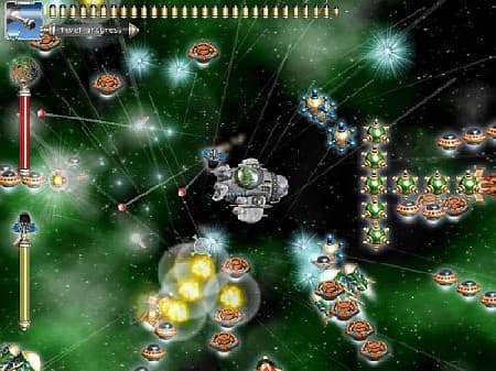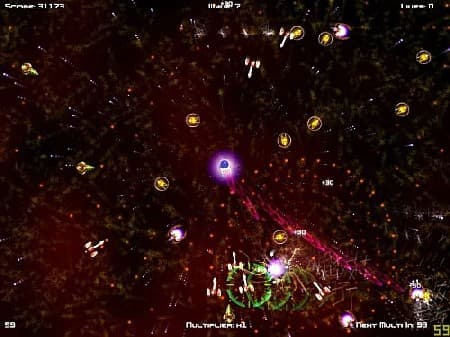 В этой игре никто даже не просит нажать на курок – из лазерных орудий маленького челнока бесконечным потоком несутся разрушительные импульсы. Игрок вынужден маневрировать и указывать новые цели, что при здешних сверхскоростных ритмах задача довольно непростая. Атакующие противники загоняют нас в пояса астероидов и минные поля, берут в клещи и заставляют отступать под перекрестным обстрелом. Отвлекают внимание и спецэффекты, постоянно вытворяющие на экране такое световое шоу, что звезды со стыда меркнут целыми созвездиями. Искрящиеся шлейфы выпущенных очередей, фейерверки разрывов, салюты из бонусов и красочная геройская гибель едва ли уступают светомузыке Plasma Pong.