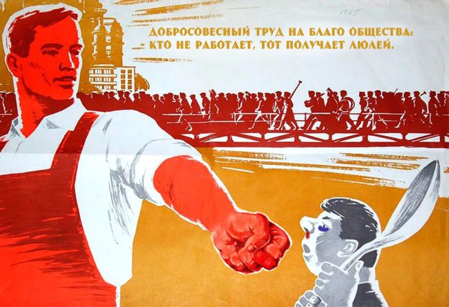А вот что действительно привлекает внимание, так это зацикленное сообщение по громкоговорителю, во всеуслышание оповещающее о том, как в советском государстве относились к труду и к тем, кто от него отлынивает:
