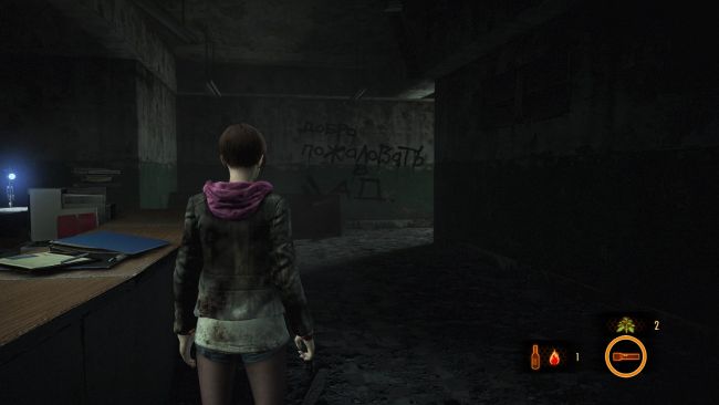 Отправляемся в соседнее строение — скотобойню. К сожалению, локация бедна на явные отсылки к СССР, в остальном это просто старое здание, доверху набитое кровищей и кишками, всё как обычно в серии Resident Evil.