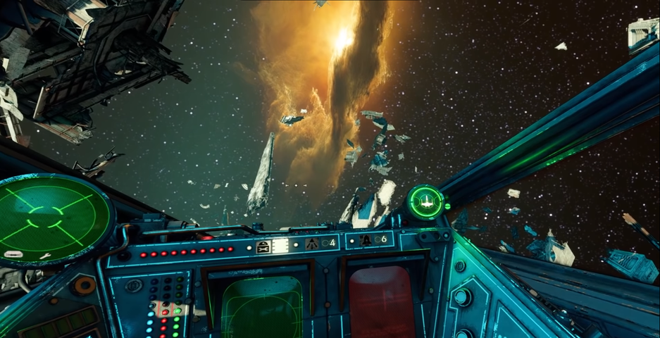Игра сильно порезана графически в режиме виртуальной реальности. Чтобы это заметить, можно даже не присматриваться. Star Wars: Squadrons имеет худшую прорисовку космоса среди большинства значимых космических VR-проектов. Если в стандартном режиме игры пользователь может и не заметить, что он летает в огромном пространстве, обтянутом четкой, но безжизненной текстурой, то в VR-режиме сразу понимает – он внутри небольшой сферы.