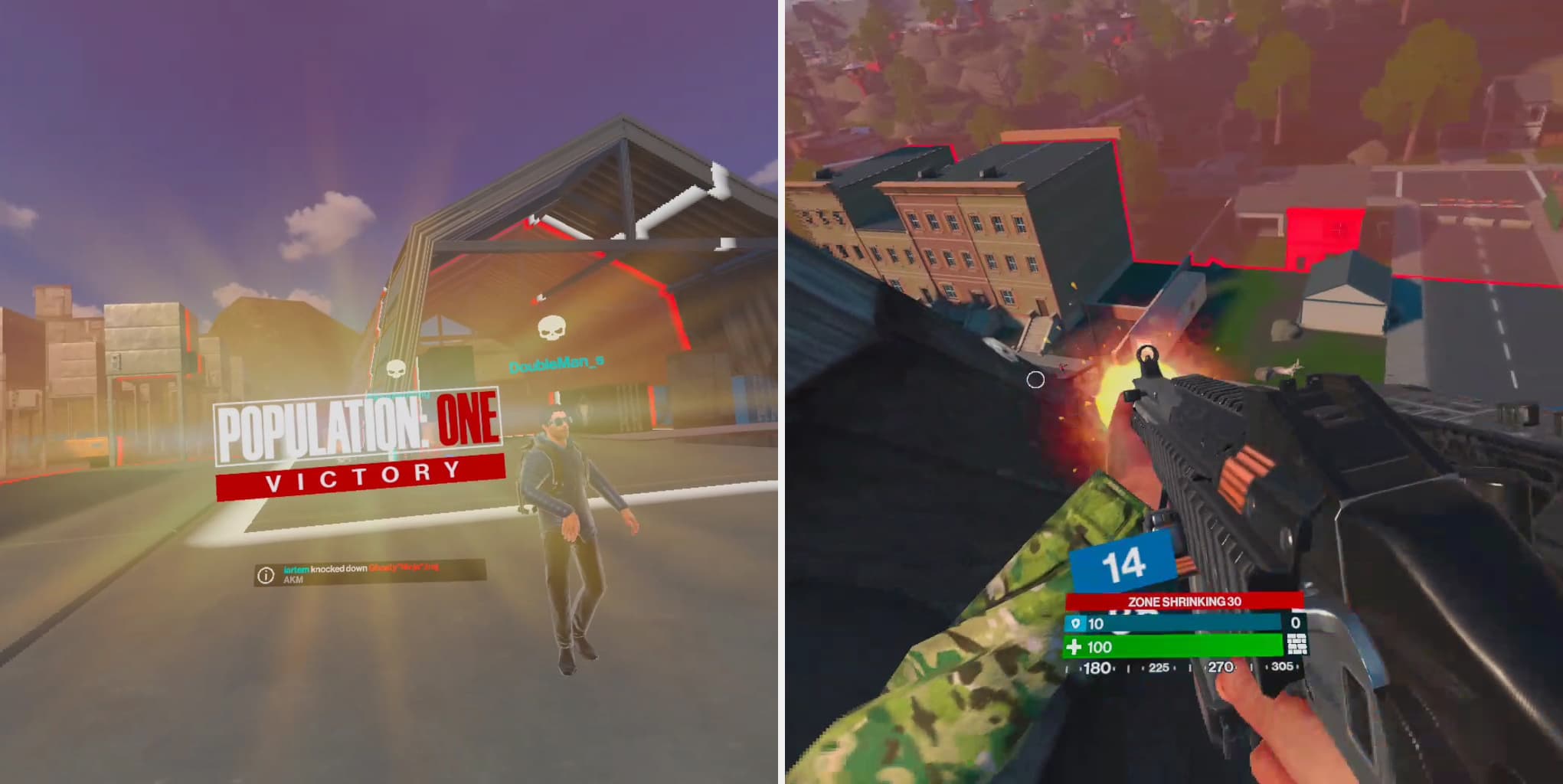 Свои скромные 18 человек и малую площадь карты, проект компенсирует невероятной быстротой динамикой развития событий. Спустя минуту после начала матча и каждые 30 секунд происходит сужение зоны, которая отхватывает огромные куски территории. Для так называемых «крыс» и «кротов», любящих спокойно засесть в укромном месте со снайперской винтовкой, Population: One покажется адом. Во-первых, игра просто не позволит подолгу находиться на одном месте. Во-вторых, любые укромные места хорошо видны с земли или воздуха, замечательно простреливаются и, при желании, туда можно в мгновении ока добраться.
