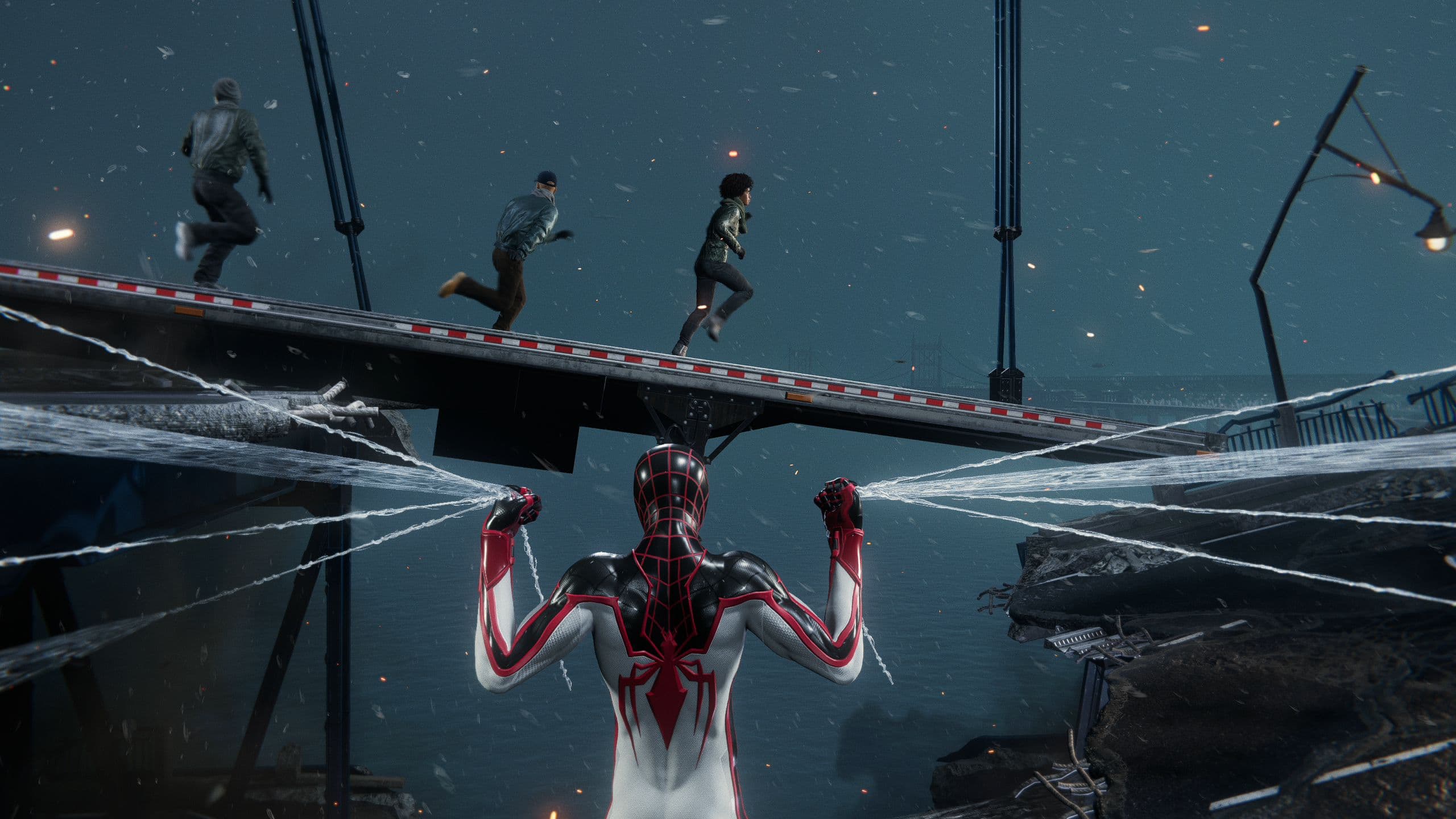 В перерывах между сюжетными перипетиями Майлз не хуже Питера носится по открытому миру, дарит потрясающие ощущения от полётов на паутине между небоскрёбами и разбирается с врагами. Поединки по-прежнему полагаются на зрелищность с молниеносными передвижениями по арене, крутыми добиваниями и уклонениями в последнее мгновение от выстрелов. Состав противников обновляется, а на Паука набрасываются здоровяки со щитами, энергетическими мечами и вдали появляются снайперы или гранатомётчики. С помощью новых способностей удаётся быстро справиться с бронированными воинами или группой обидчиков, но подобный штрих не претендует на роль революционного изменения в боевой системе.