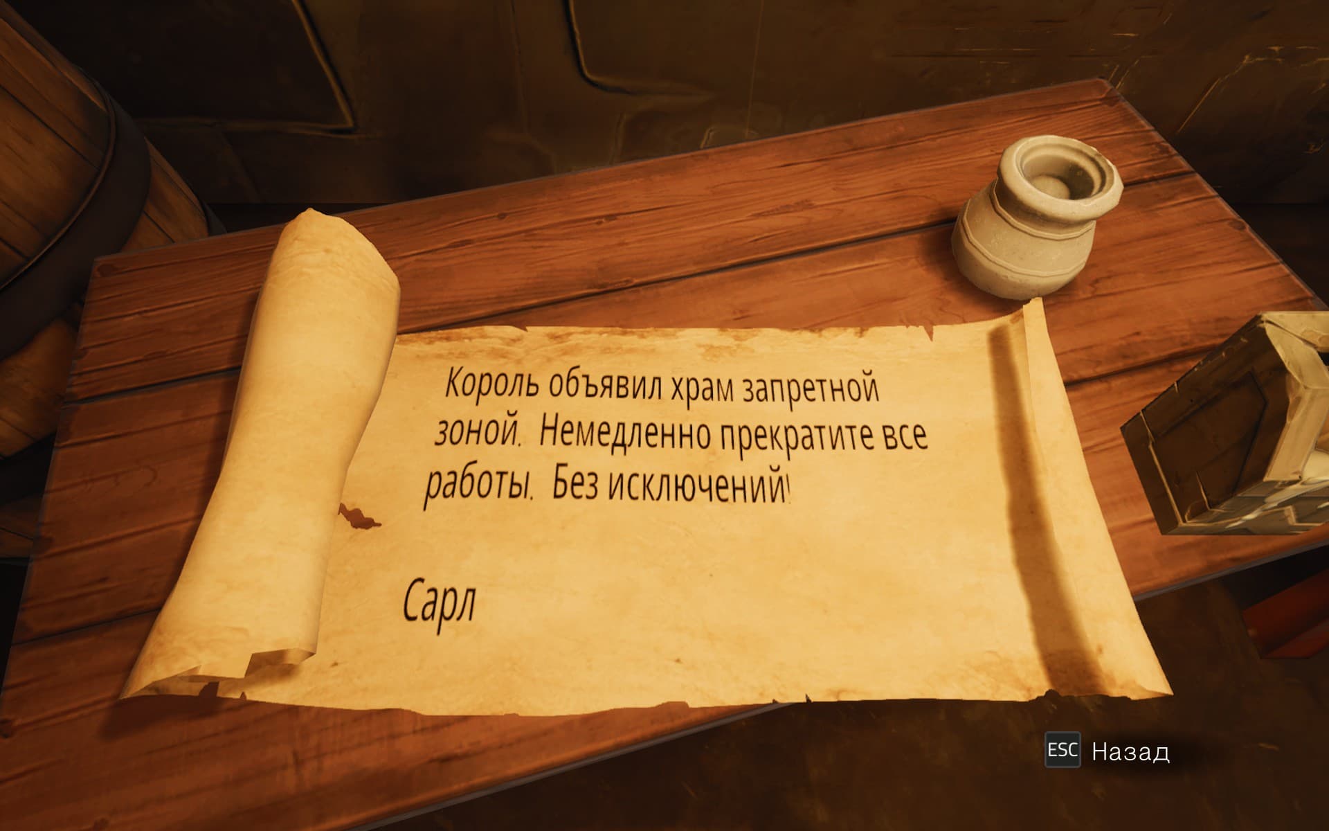 Появился перевод на русский язык, но без озвучки. Однако за шрифт в локализованной версии надо бить по рукам. Если в оригинале в книгах и на свитках рукописные надписи, в русской версии там просто вставили текст с шрифтом Arial. Некоторые свитки просто обрываются на полуслове, потому что содержимое банально не влезло. Неужели так сложно найти хоть издали похожий кириллический шрифт и использовать его?