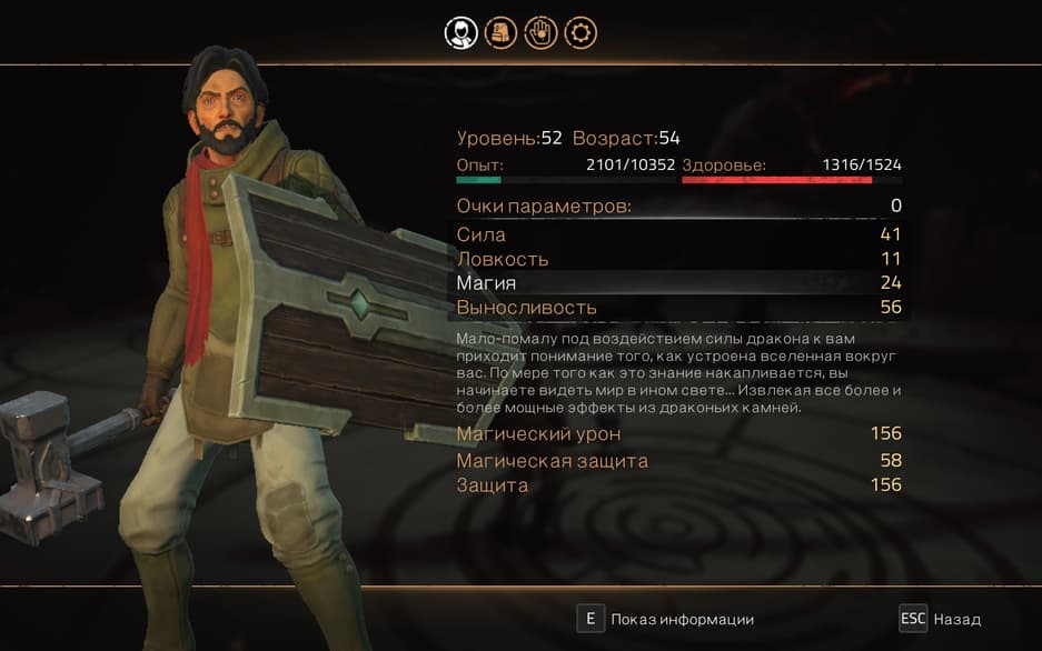 Отдельно стоит упомянуть прокачку, наверное, самую оригинальную из всех Souls-like игр. Опыт копится после убийств врагов и с помощью очков навыков можно прокачивать одну из четырёх характеристик: силу, ловкость, магию и выносливость. Но есть один нюанс – в зависимости от возраста Избранного, эффективнее качаются разные характеристики. Каждая смерть персонажа – плюс один год к его возрасту. И ты начинаешь считать каждый год и осторожнее играть.