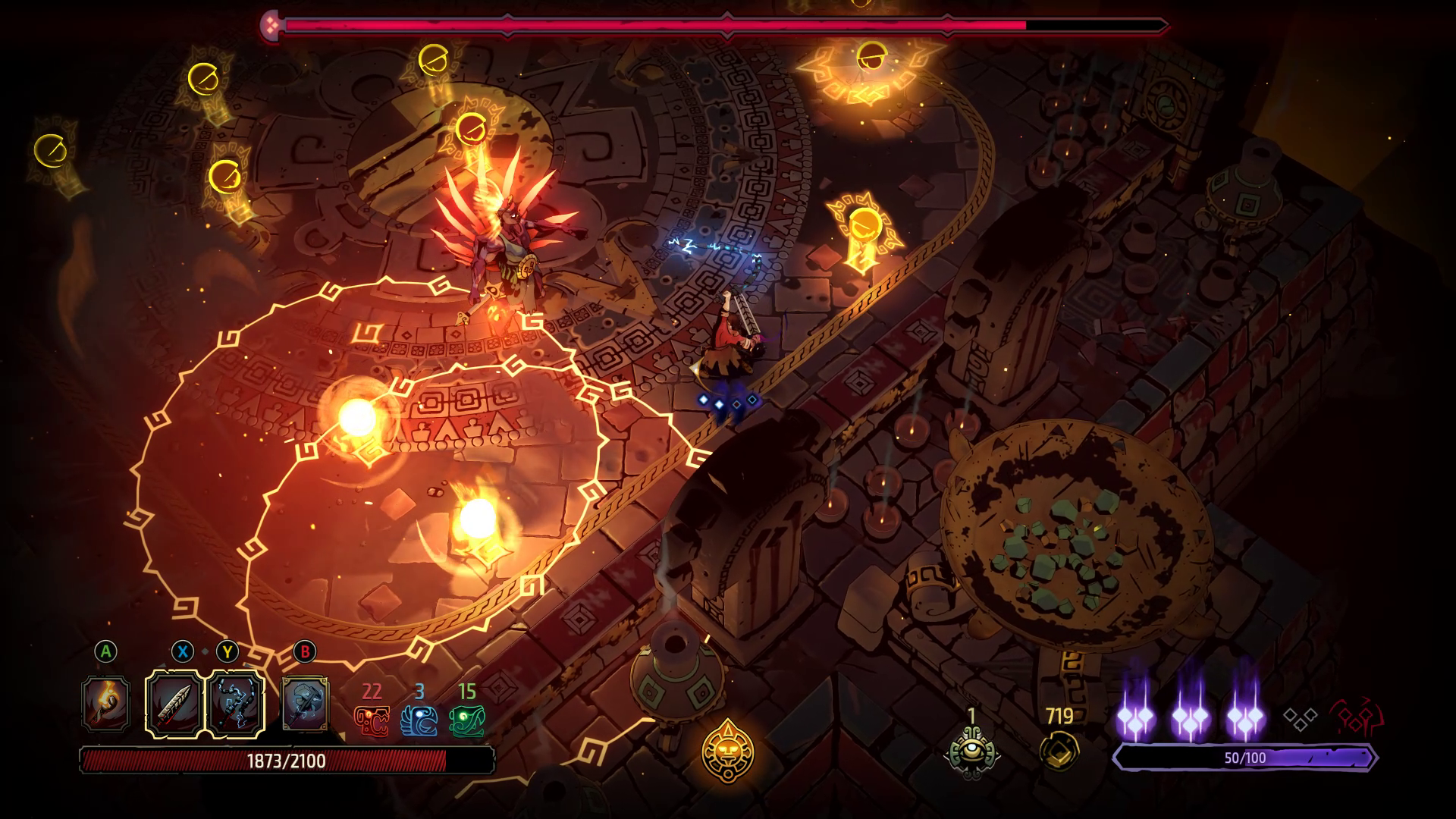 Игра не сразу показывает свое злое личико. Поначалу она дает тебе опробовать первый этаж каждого из трех Храмов, убить по одному боссу. Ты легко их пробегаешь, боссы не сложные, тема с проклятиями особо не беспокоит, поскольку забеги короткие. Но потом открывается второй этаж, третий, а дальше — настоящая игра — Пантеон, где условия ужесточаются. Можно ли пройти эту игру до конца? Наверное. Но каждый раз, когда ты почти-почти добрался и уже готов наслаждаться заслуженной победой, тебя вежливо хлопают по плечу и разворачивают в сторону новых, куда более суровых испытаний, обесценивая твои завоевания.