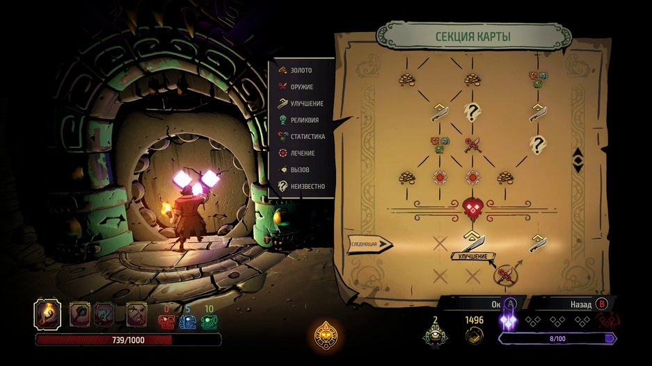 Нет, герой не кроет матом разработчиков — с этим прекрасно справляется игрок. Проклятия — это часть игровой механики. Чем дальше ты углубляешься в мрачную пирамиду, тем больше Порчи ты получаешь. Проходишь сквозь дверь, хочешь подлечиться — Порча растет. Увидел желанное оружие или реликвию, а денег нет — жертвуй кровь, и Порча растет. А с ней ты получаешь случайное Проклятие, среди которых есть как безобидные, так и очень жестокие, вплоть до потери интерфейса и преследующих в темноте призраков. Каждый сундук превращается в ловушку, за проход в следующую комнату ты теряешь деньги, золото на земле быстро исчезает... И проклятия со временем накапливаются. Самое страшное — пятое. По сути, ты превращаешься в беспомощную грушу для одного удара. Тюк — и на перерождение.