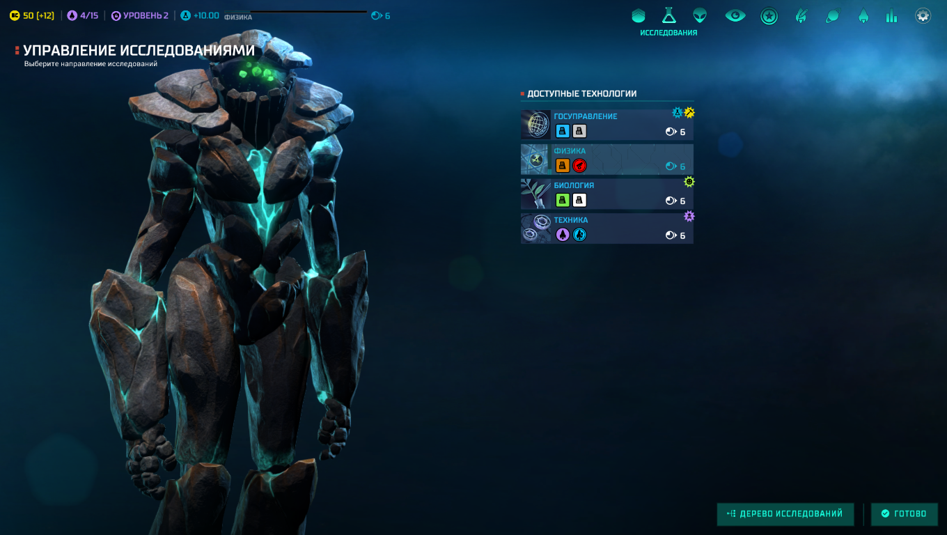 Кроме того, почти на каждом из этапов придется выбирать какую-то одну из двух или трех технологий. Открыть все технологии смогут только «креативные» расы, «некреативные» выбирать не смогут. Что взбрело в голову ученым, то и открыли. Получить недоступные знания можно только при обмене с другими империями или с помощью шпионажа.