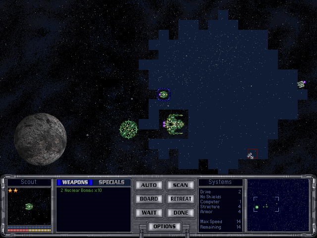 Сражения проходят в тактическом пошаговом режиме. Флоты сторон по очереди обмениваются ударами. При штурме систем обороны планет придется вскрывать орбитальные оборонительные сооружения, планетарные щиты, разрушать наземные оборонительные сооружения. В мультиплеере этот режим был, пожалуй, единственным недостатком Master of Orion II.