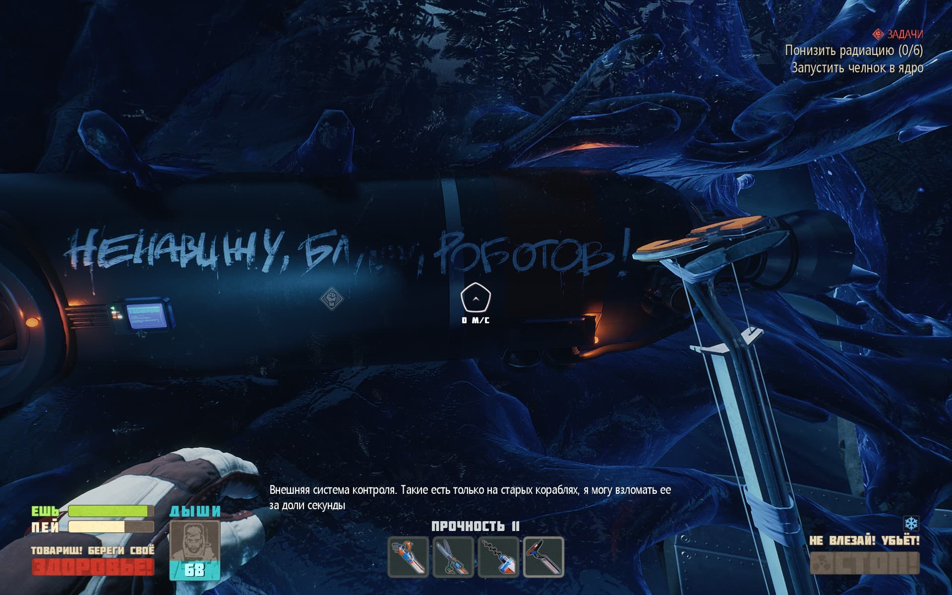 Разработчикам было и этого мало. Представьте ситуацию. Вы уже достаточно развились, исследуете космос. И пусть десятиминутный полёт без каких-либо происшествий вряд ли можно назвать громким словом «исследование» – вы долетаете до сюжетной локации. Слушаете ироничный и шутливый монолог вашего скафандра, в котором выясняется, что для запуска охлаждения реактора нужно топливо. Его необходимо создавать отдельно, и у вас случайно в инвентаре его не оказалось. Мало того, что вы 10 минут летели просто так – теперь нужно возвращаться тем же путём на базу, искать материалы для создания топлива и лететь обратно. Увлекательные 30 минут зевоты и чтения новостной ленты, пока Мужик бороздит просторы мёртвого космоса, а игрок жмёт клавишу «W», изредка ускоряясь с помощью кнопки Shift.