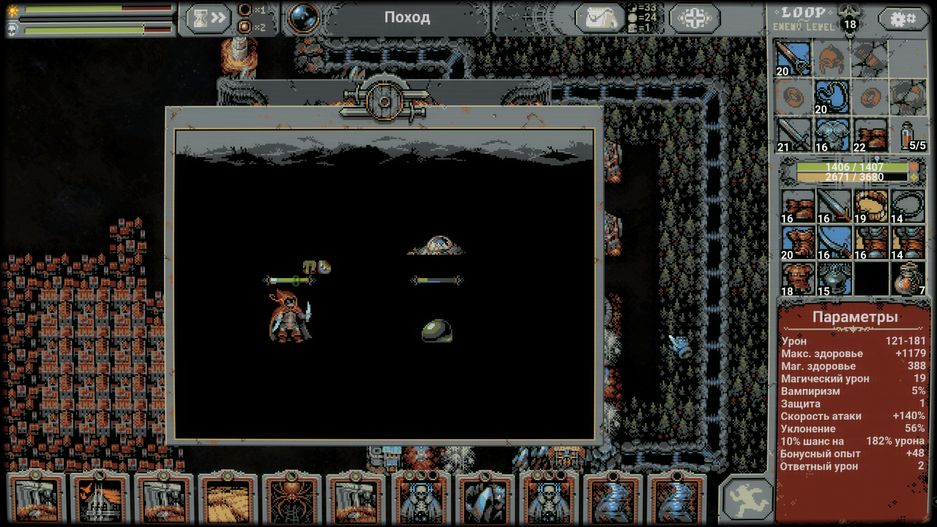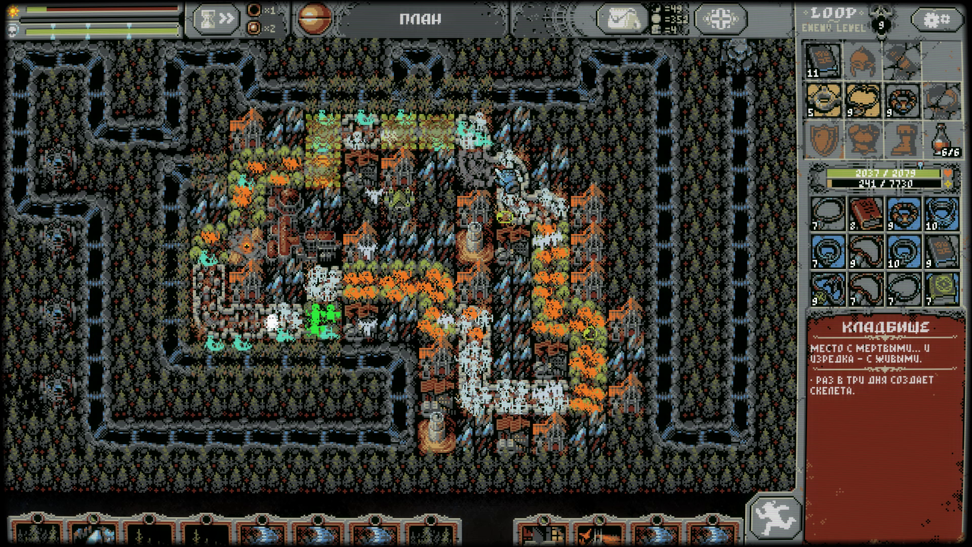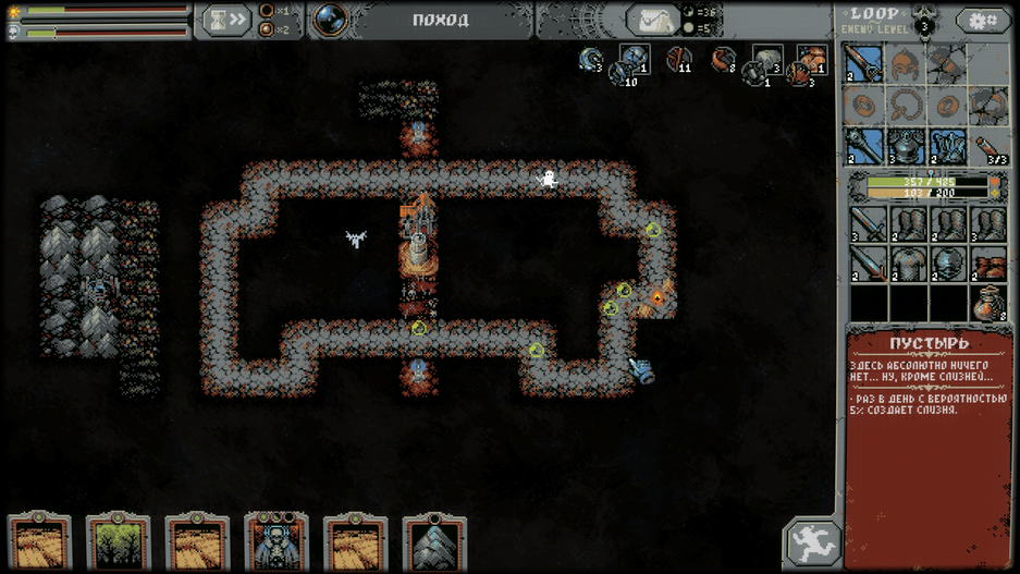 Если описывать Loop Hero тарабарщиной игрового сленга, то это рогалик-автобатлер с элементами коллекционной карточной игры, градостроительного симулятора и хранителя подземелья. Звучит как чушь. Если описать подробно, понятнее не станет. Герой ходит по тропе в пустом черном пространстве и самостоятельно сражается с монстрами. Игрок при помощи выпавших из монстров карточек (типа «гора», «лес», «река») постепенно достраивает мир по клеточкам, причем каждый лоскуток имеет положительные или отрицательные эффекты, которые поначалу неочевидны. Поставил кладбище — полезли скелеты; деревеньку — начал получать задания на уничтожение сильных врагов; шлепнул рядом с деревенькой вампирскую усадьбу — все ее жители превратились в зомби... Сюрприз!