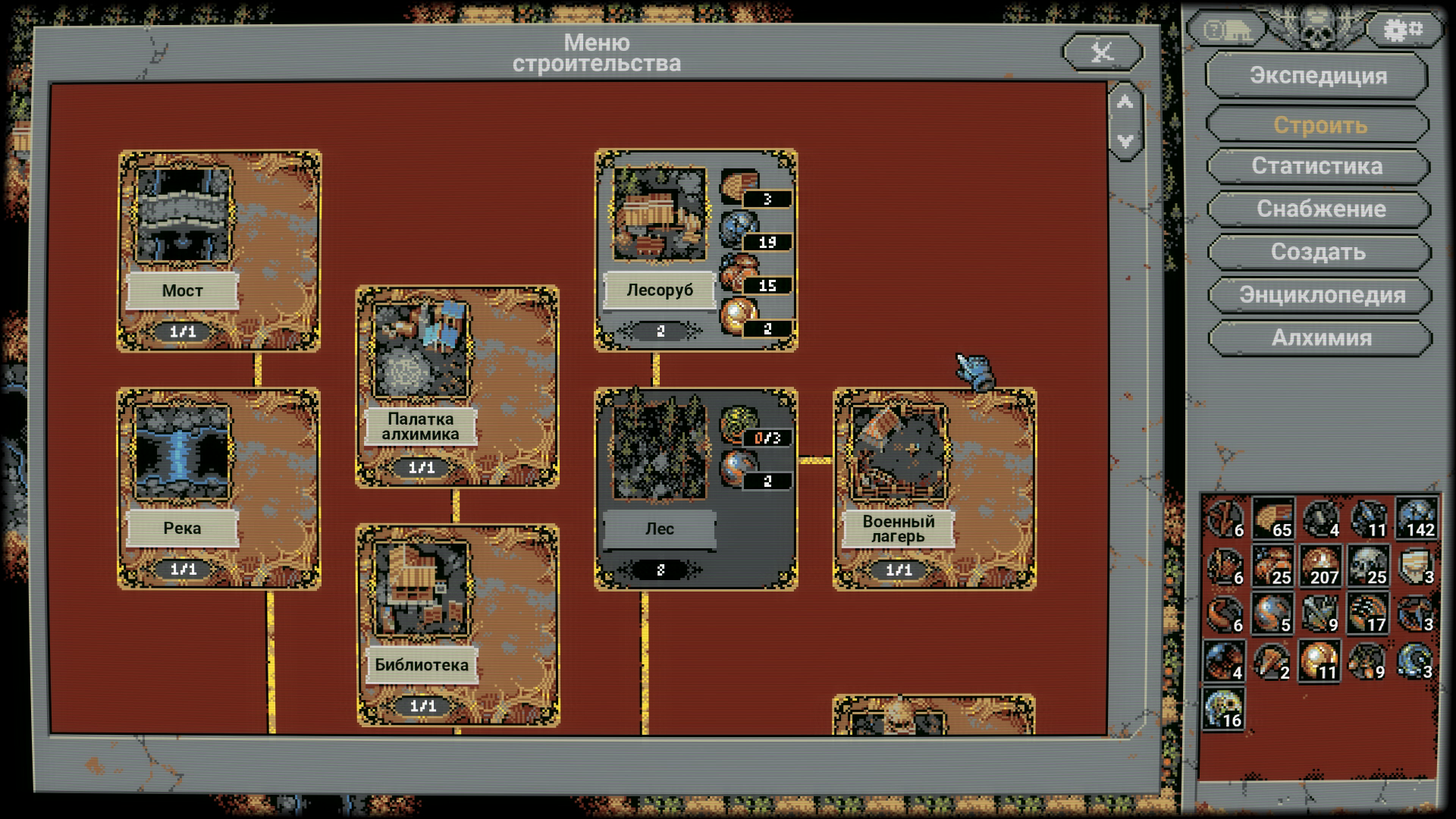 Отправной точкой выступает лагерь. Его надо долго обустраивать, собирать ресурсы, возводить сторожевые башни, фермы, землянки, алхимическую лабораторию и даже реку. Строений множество, некоторые из них можно улучшать (тем самым повышаются пассивные навыки героя). Пройдут десятки часов, и все равно в лагере будет, чем заняться. Особенно если ошибиться со строительством, неэффективно распорядится ограниченным пространством. Сносишь здания и возводишь в другом месте.
