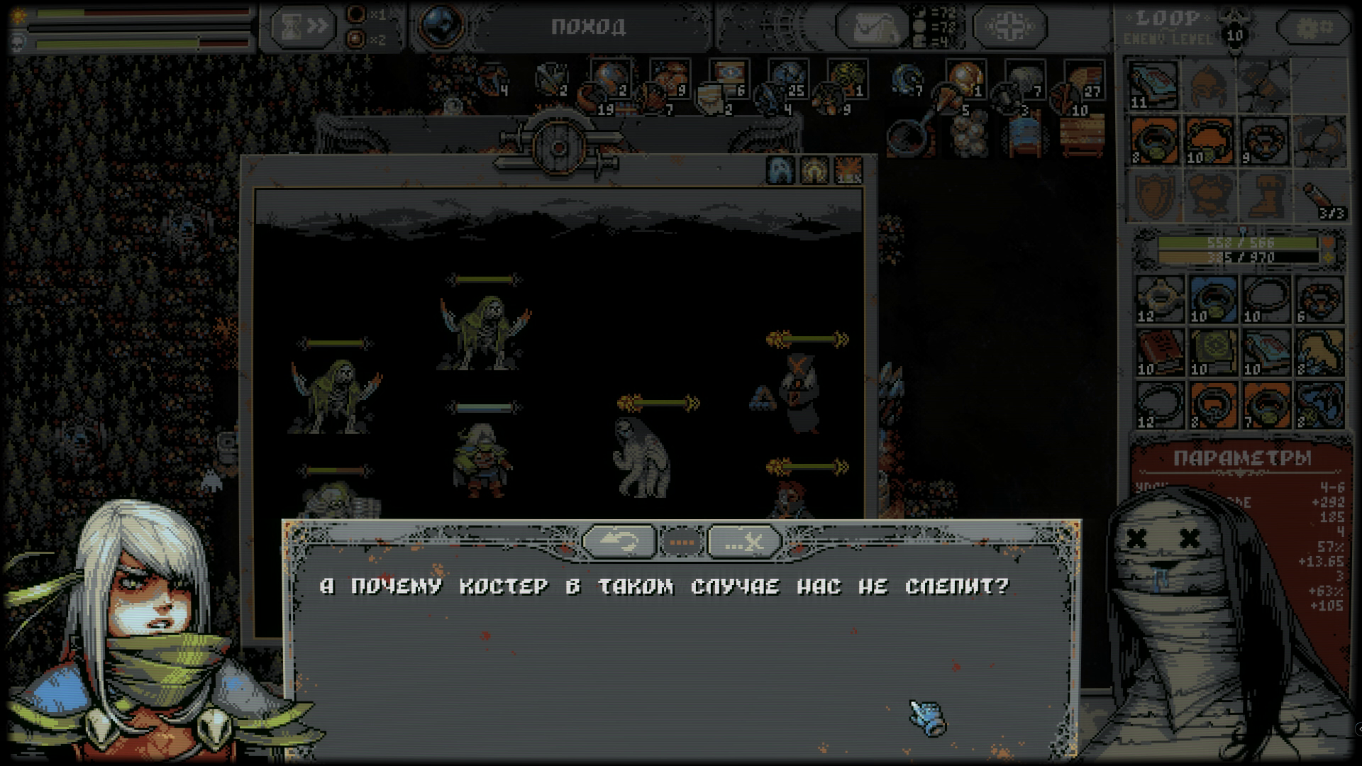 Эффект Loop Hero можно сравнить с попыткой собрать вечный двигатель. Герой ходит по кругу, и твоя задача — сделать такого парня, который бы автономно сносил все на своем пути. С каждым кругом монстры усиливаются, так что героя надо быстро качать. Чем больше разнообразие врагов, тем лучше награды, но при этом так легко споткнуться... Вас будут долго преследовать неудачи, но потом вдруг все получится, и герой понесется комбайном перемалывать врагов на полностью застроенной карте мира. Круг за кругом, походя уничтожив всех боссов.