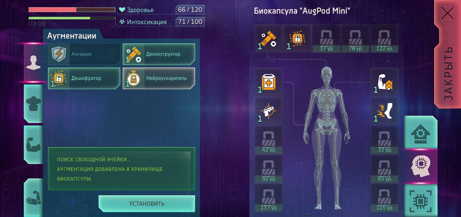 А также развивать пассивные навыки. С ростом уровня открываются новые разъемы под чипы-аугментации (лат. augmentatio, от augmentare увеличивать, усиливать) и растет здоровье. Традиционных для ролевых игр параметров силы, восприятия, выносливости, харизмы, интеллекта, подвижности и удачи тут нет. Так что качаем опыт, устанавливаем нужные чипы.