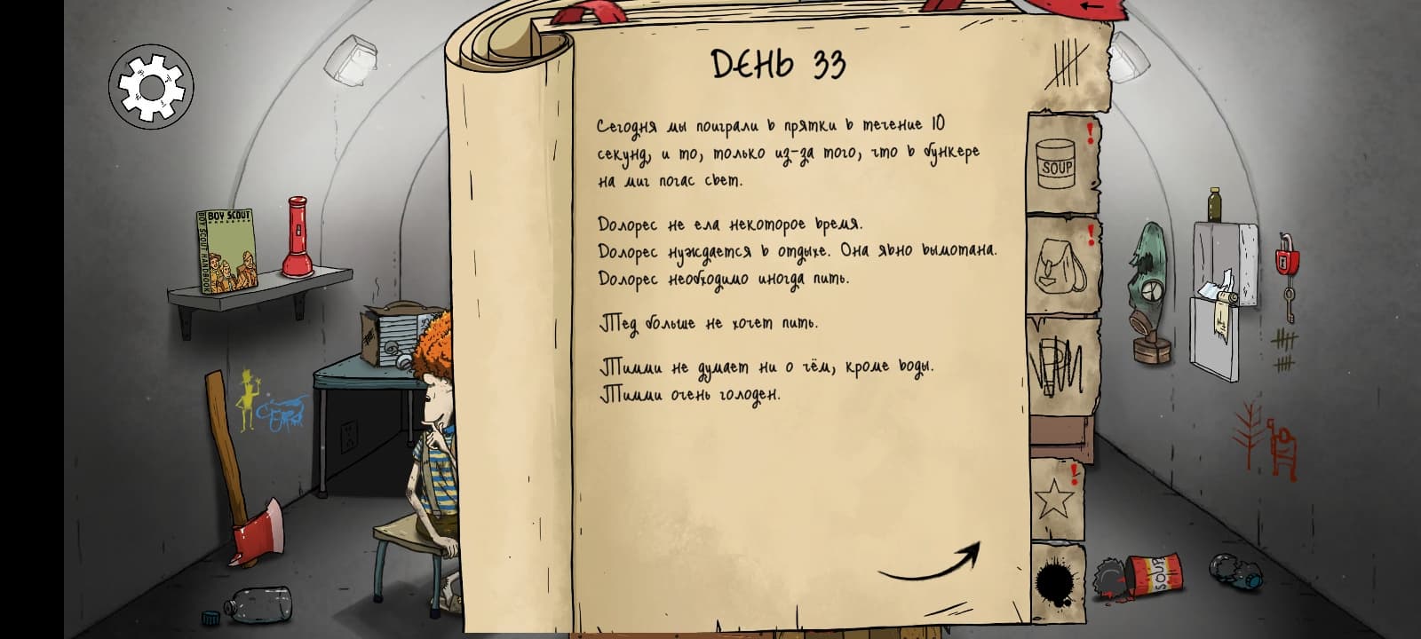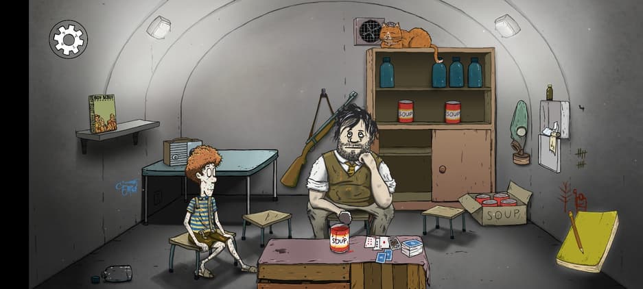 Разворачивающуюся в бункере драму иллюстрируют на главном экране. Иногда стоит закрыть дневник выживальщика, посмотреть на персонажей и окружающую обстановку. Там обнаружится много любопытных и забавных деталей. И сам графический стиль хорош. Музыкальное оформление тоже не подводит и создает соответствующую атмосферу.
