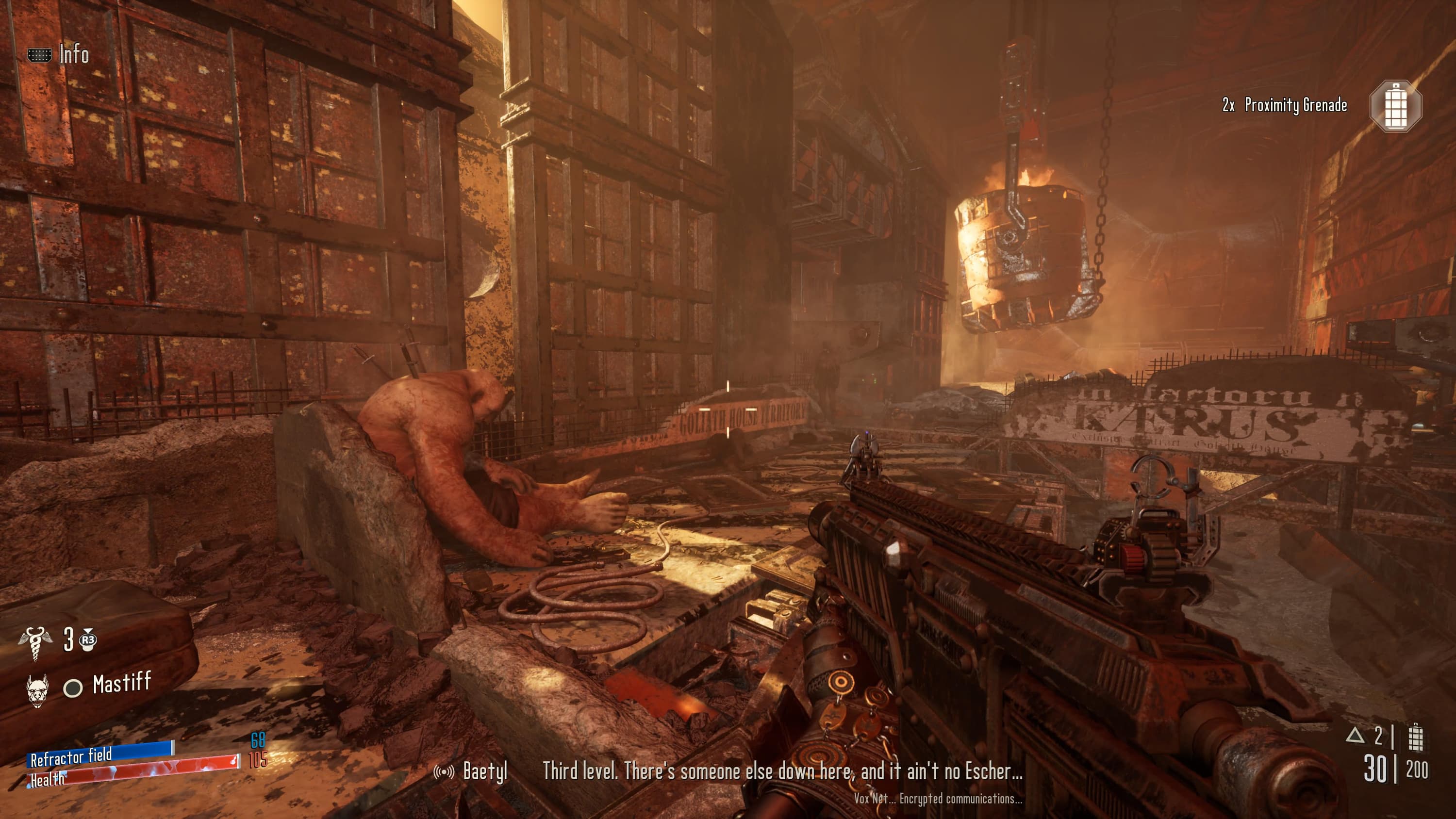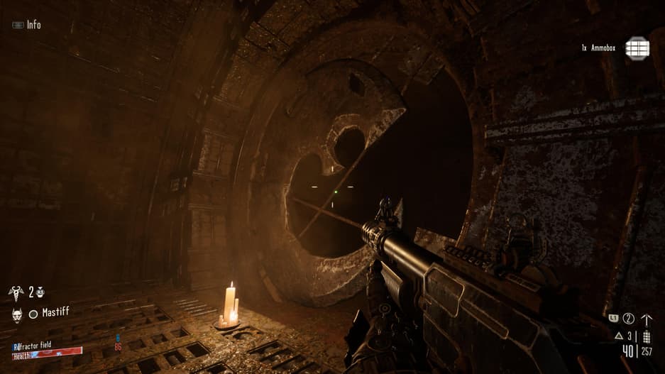Также непонятно, зачем в игру было решено добавить мастиффа. Псину можно позвать на подмогу игрушкой-пищалкой, но толку от нее как от камня меду. Даже после прокачки она все равно не будет успевать за пулей носящимся по аренам наемником и, покусав несколько врагов, убежит отдыхать. К слову о прокачке. Улучшать характеристики наемника можно исключительно в перерывах между поручений в центральном хабе, совмещающий в себе паб с общительной девушкой-барменом, оружейную с надменным механикусом и богадельню с умелым хирургом. Здесь же можно брать и дополнительные задания, никак не связанные с основной сюжетной линией, но зато помогающие заработать лишнюю монету на дополнительную батарейку в силовом поле.
