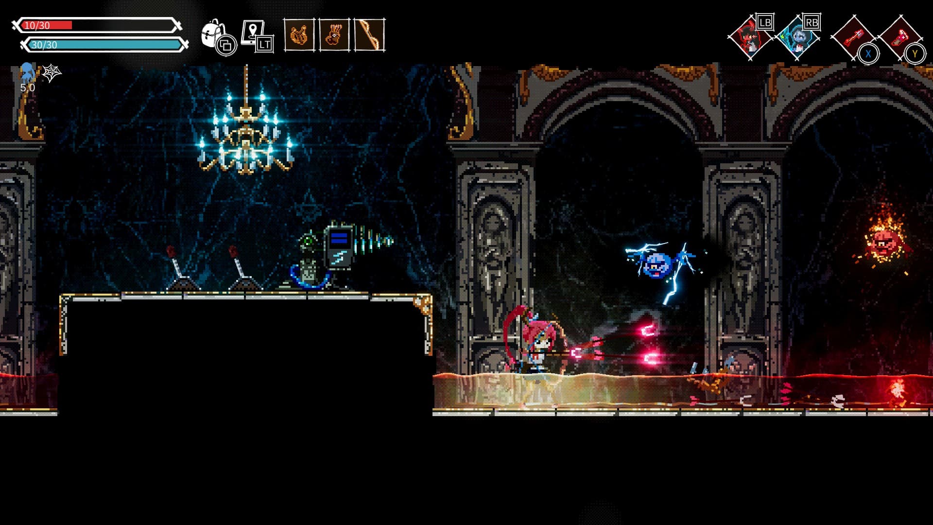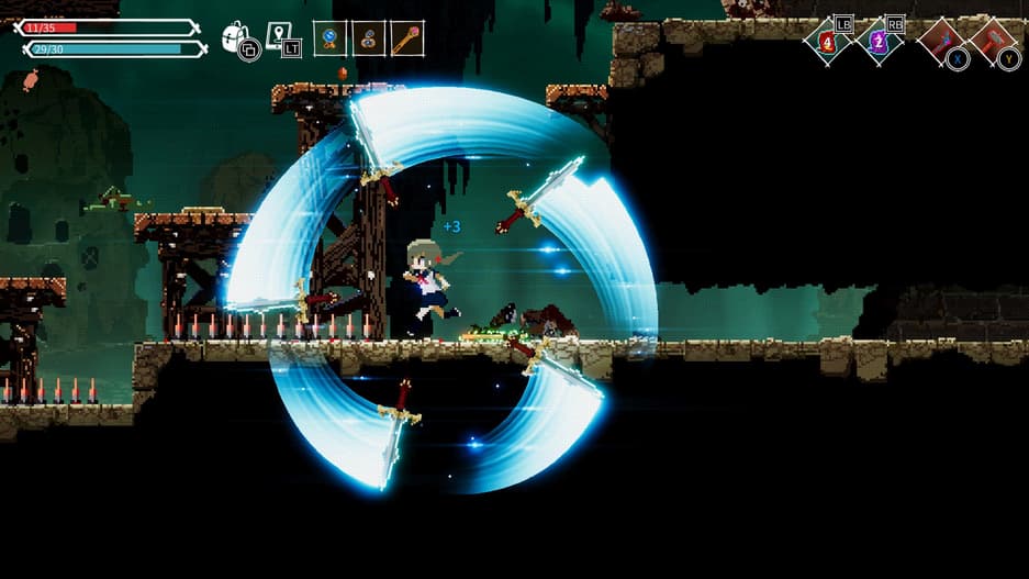 Заклинание «Призыв Меча» (три вращающихся вокруг героини меча, отбивающих снаряды и наносящих урон). Если при этом использовать «Плащ Вампира» (лечит при нанесении урона заклинанием) и добавить предметы на восстановление маны, то на выходе мы получим мясорубку, которая отбивает снаряды, наносит урон, восстанавливает здоровье, да еще и кровотечение на врагов накладывает! А после нахождения «невидимости», игра превращается в шутку! В таком состоянии Героиню никто, включая боссов, не способен видеть. Это позволяет пробегать локации, не отвлекаясь на монстров. Гарантированные же криты позволяют быстро разделываться с оставшимися боссами.