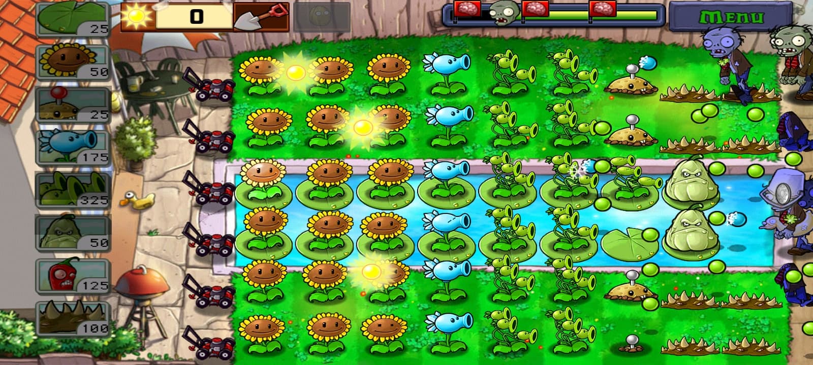 Казалось бы, все просто. Как бы ни так! Вариантов построения грамотной обороны много, но не все они обеспечат легкую жизнь. Необходимо тщательно подбирать семена перед каждым уровнем, чтобы суметь одолеть несколько волн врагов. И в кампании таких уровней нужно пройти пятьдесят — лужайка перед домом днем и ночью, бассейн за домом днем и ночью (в тумане!), на крыше.