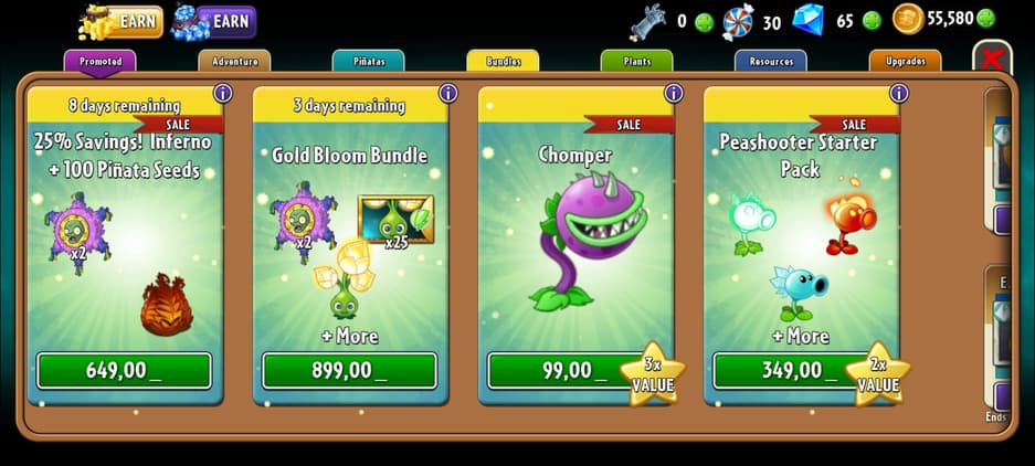 За реальные деньги продаются и крутые растения. В соревновательном мультиплеере (на арене игроки стремятся набрать большее число очков при прохождении определенного уровня) это имеет большое значение. За премиальную валюту приобретаются и дополнительные попытки игры на арене. Растения необходимо прокачивать с помощью пиньят-лутбоксов. На средних уровнях сложности на геймплей прокачка не влияет, но чем дальше, чем сложнее играть базовыми растениями.