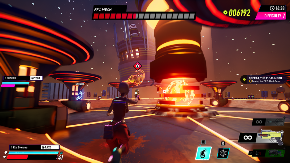 Мы оказываемся на стандартной арене, где на нас постоянно телепортируются противники. И торчать на ней придется до тех пор, пока не выполним задание: захват точки, уничтожение летающих платформ и т.д. Проходим уровень, попадаем на другую арену. В перерывах уровень сложности увеличивается. Также его можно повышать самостоятельно, за местную валюту. От него зависит количество врагов, наносимый ими урон и уровень здоровья.