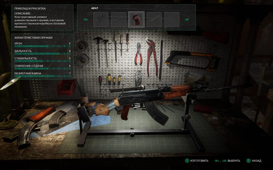 Модификация оружия радует не только с эстетической, но и с практической точки зрения. Например, мне не нужна была штурмовая винтовка, однако дальнобойным оружием пользоваться хотелось. С помощью специального стола для модификации автомата, удалось превратить АК-74 в снайперскую винтовку и убивать врагов издалека. Пусть видов вооружения всего пять штук, каждый служит для определённых целей.