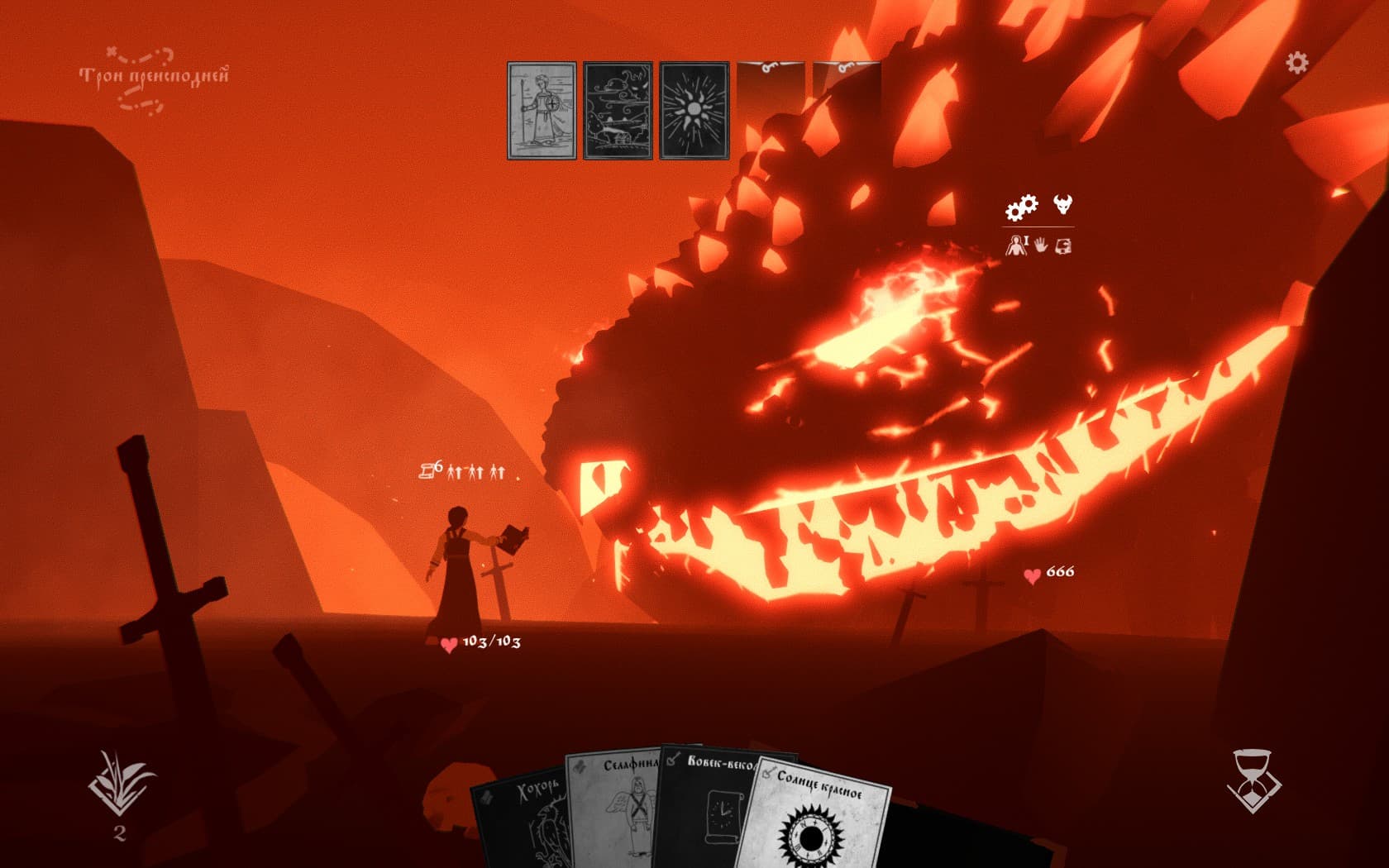 Стоит отметить весьма путанный интерфейс. Поначалу так просто обескуражтвающий: что тут делать? Где тут жать? Строка состояний в бою быстро переполняется, и приходится пролистывать ее, чтобы увидеть, какие эффекты действуют на Василису или противника. Из-за этого я в последнем бою выпустил в молоко две сильнейших комбинации. Они просто не нанесли никакого урона боссу, потому что на него не действуют заговоры, составленные только из черных карт — это-то я и пропустил.