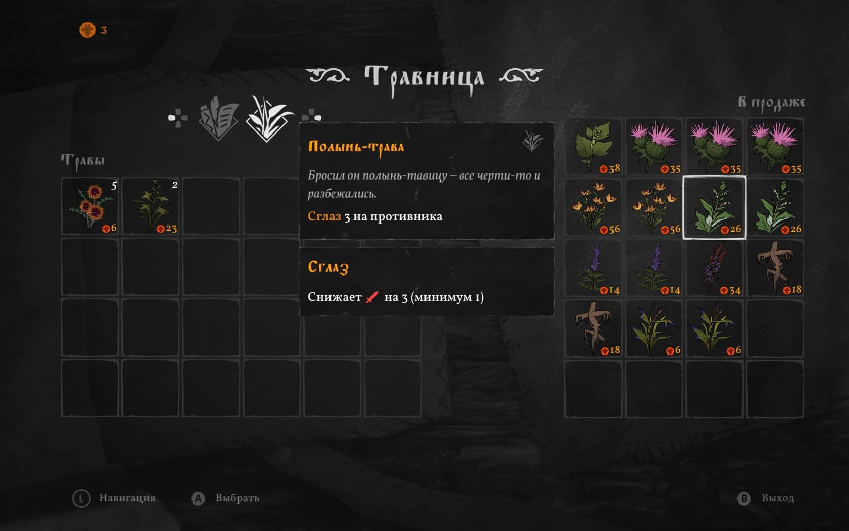 Также в бою можно использовать травы со множеством разных полезных эффектов и пассивные бонусы от носимых вещей. С начала первой главы у героини будет возможность брать с собой союзника, который также раз в несколько ходов может помогать особым умением. Таким образом я в последних главах за несколько ходов набирал себе усиление под сотню, и урон от одного заговора мог переваливать за двести-триста единиц — при том, что у финального босса всего 666 единиц здоровья.
