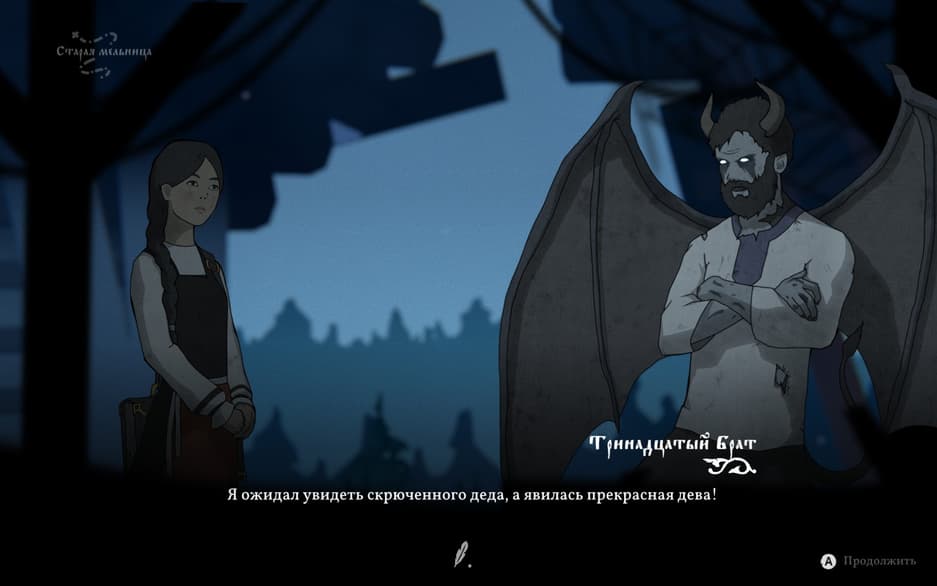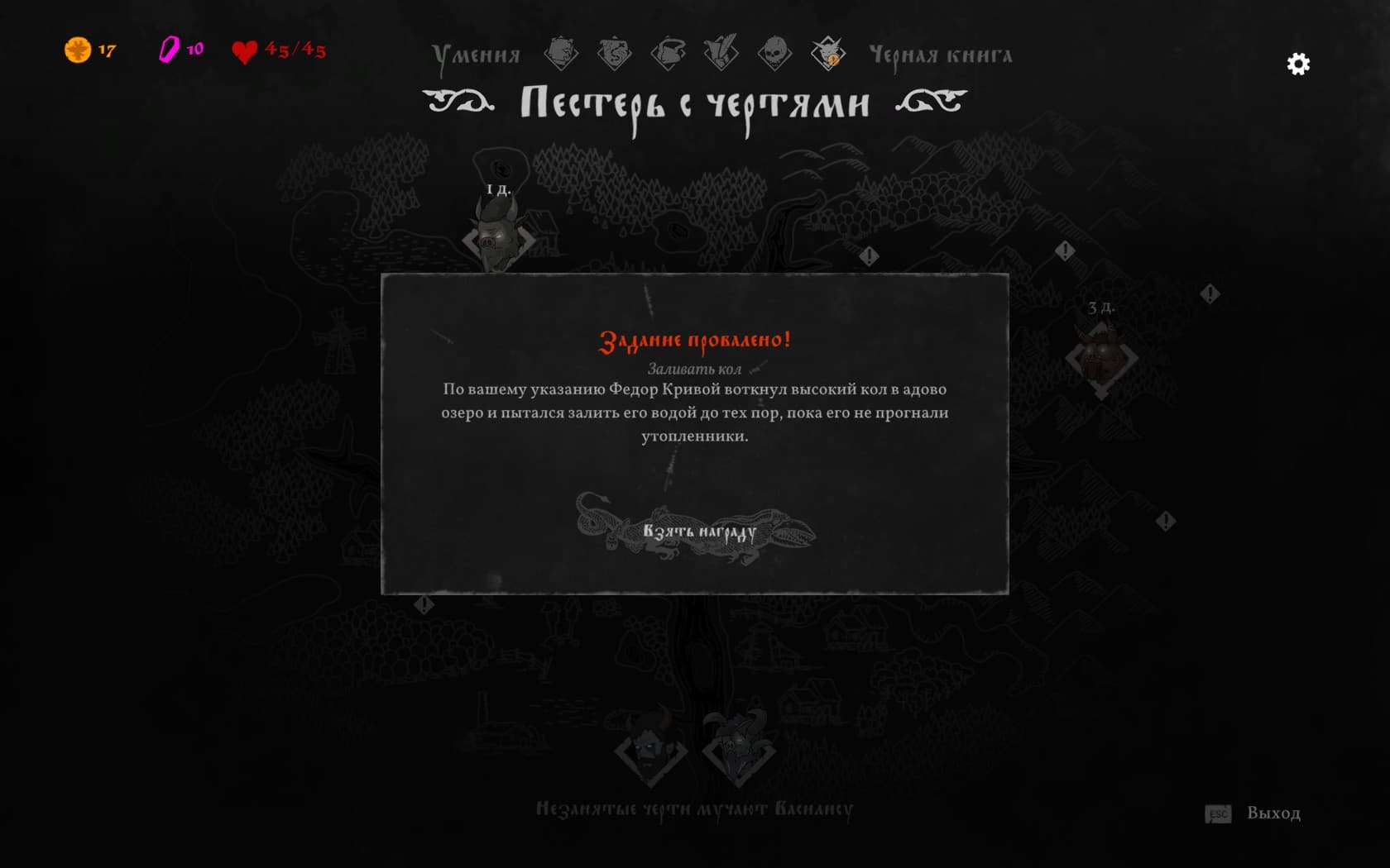 Например, в середине игры у меня была колода, заточенная на сглаз — ослабление урона противников. С картой «Моря глубина», трижды наносившей бесу урон, равный уровню его сглаза, колода становилась эффективной против боссов. А даже если подружиться с местной боевой системой не получилось, игра предложит пропустить сражение — достаточно проиграть его дважды. Каюсь: один раз воспользовался.