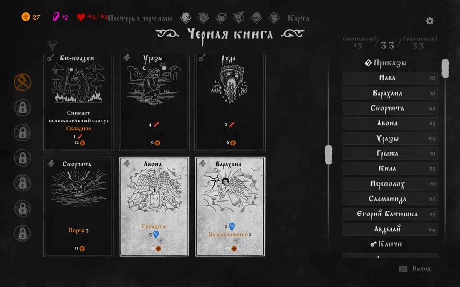Рисовка в игре отличная. Иконки персонажей уникальны и проработанны – каждую новую нечисть при встрече хочется изучать и разглядывать. Гравюры на картах в «Черной Книге» — эдакие примитивные зарисовки — здорово передают как характер самой карты, так и общее впечатление народной магии и заговоров. На фоне такой работы художников даже возникает вопрос: почему было не взять пример со Slay the Spire и не сделать игру двухмерной полностью?