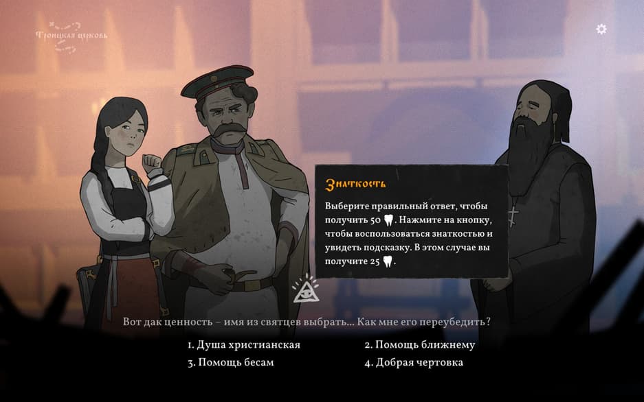 При желании игру можно пройти практически не сражаясь: многие ситуации не требуют боя. Если проявлять осторожность, можно избежать и большинства нападений, где инициатива находится на стороне нечисти. Временами «Черная Книга» проверяет игрока на внимательность. Персонаж может задать героине вопрос, основанный, опять же, на мифологии, и тогда игра предложит несколько вариантов ответа. Если игрок прилежно исследовал все доступные встречи и читал найденные статьи и былички — вопрос затруднений не вызовет, а еще и принесет бонус в виде опыта. Более того, некоторые ответы можно угадать, даже не читая энциклопедии. Все-таки, наш фольклор.