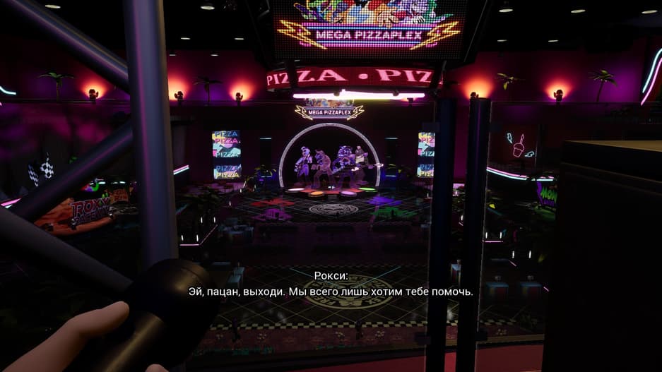Сам Пиццаплекс — забавное место. Оно отлично передает атмосферу аттракциона для детей. Там присутствует и зона для малышей, и гоночный трек, и лазертаг, и спортивный зал. На всех элементах окружения присутствует реклама с аниматрониками. Они выполнены в виде голограмм, постеров, игрушек. Даже мусорки раскрашены под них!