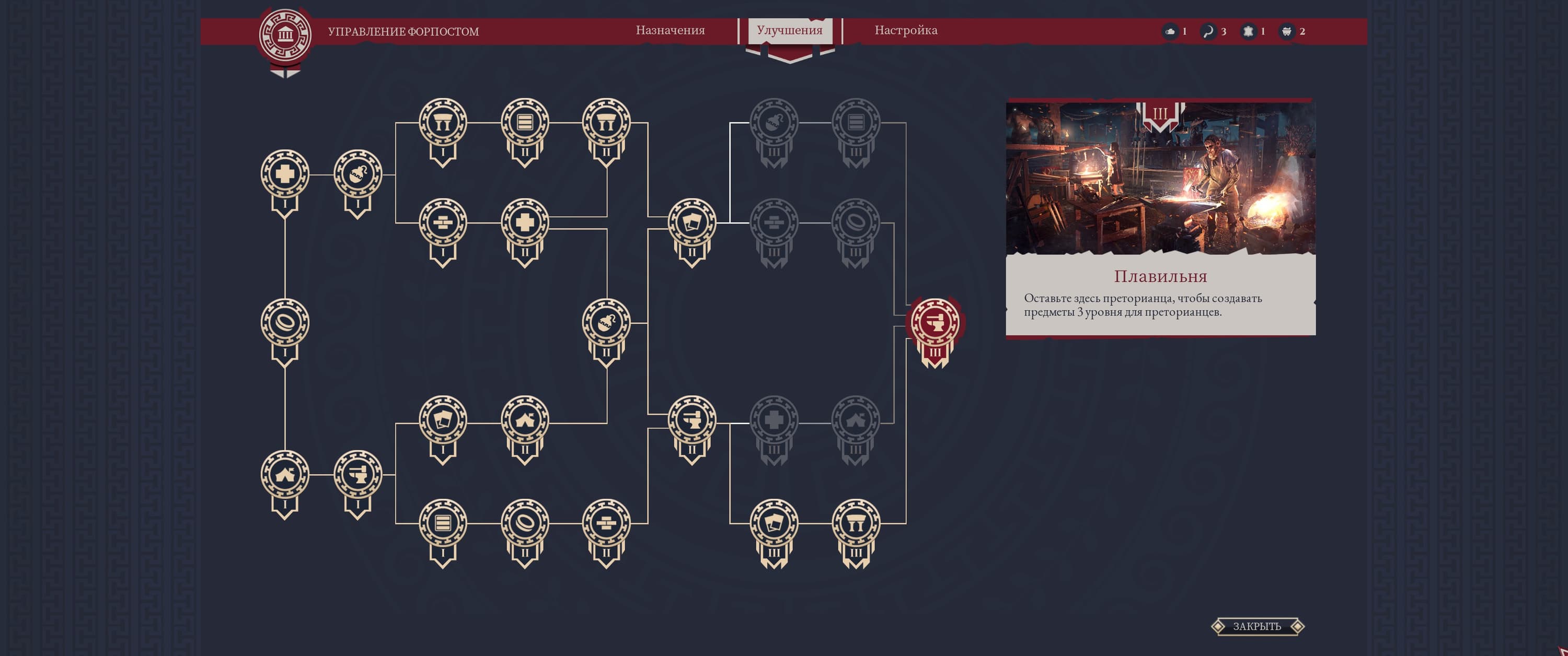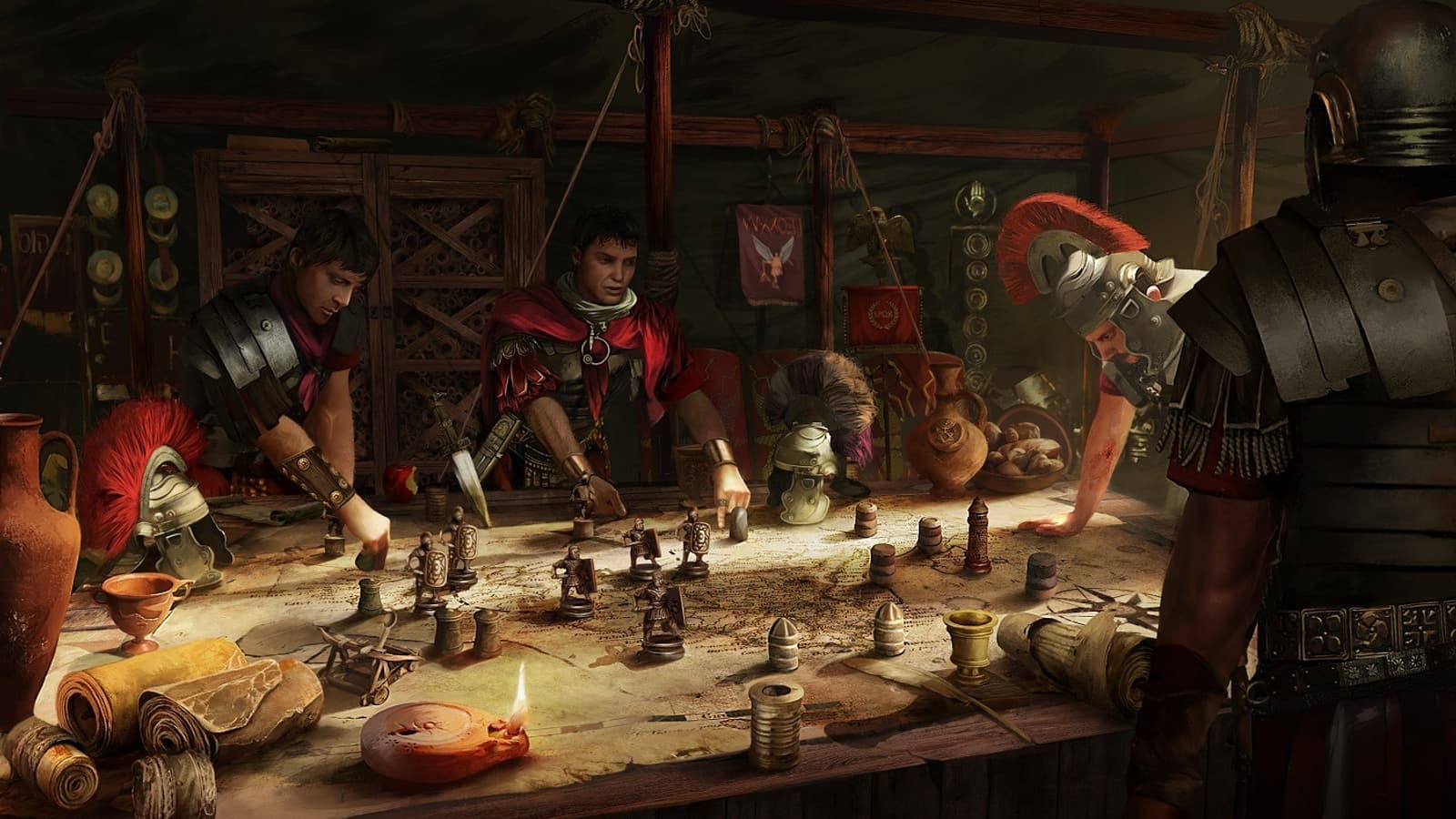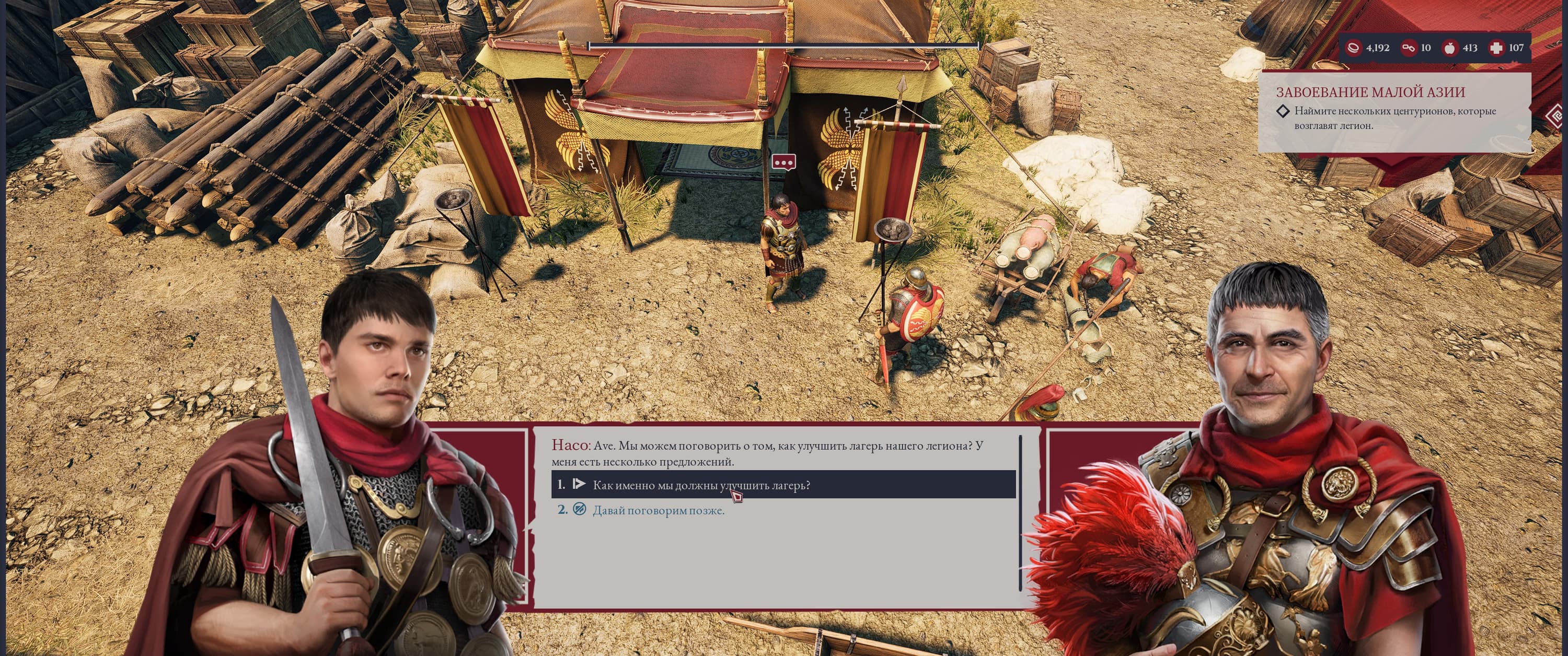 Механика развития лагеря весьма обширна. Мы можем ускорить время выздоровления своих соратников, улучшив лазарет, открыть более совершенные рецепты у кузнеца, изучить прогрессивные тактики боя для легиона и многое другое. Все эти улучшения изменяют внешний вид лагеря, а соратники и простые легионеры не упускают возможности обсудить действия командира в приватных беседах в карауле или за трапезой, попутно сравнив свои достижения с другими легионами.
