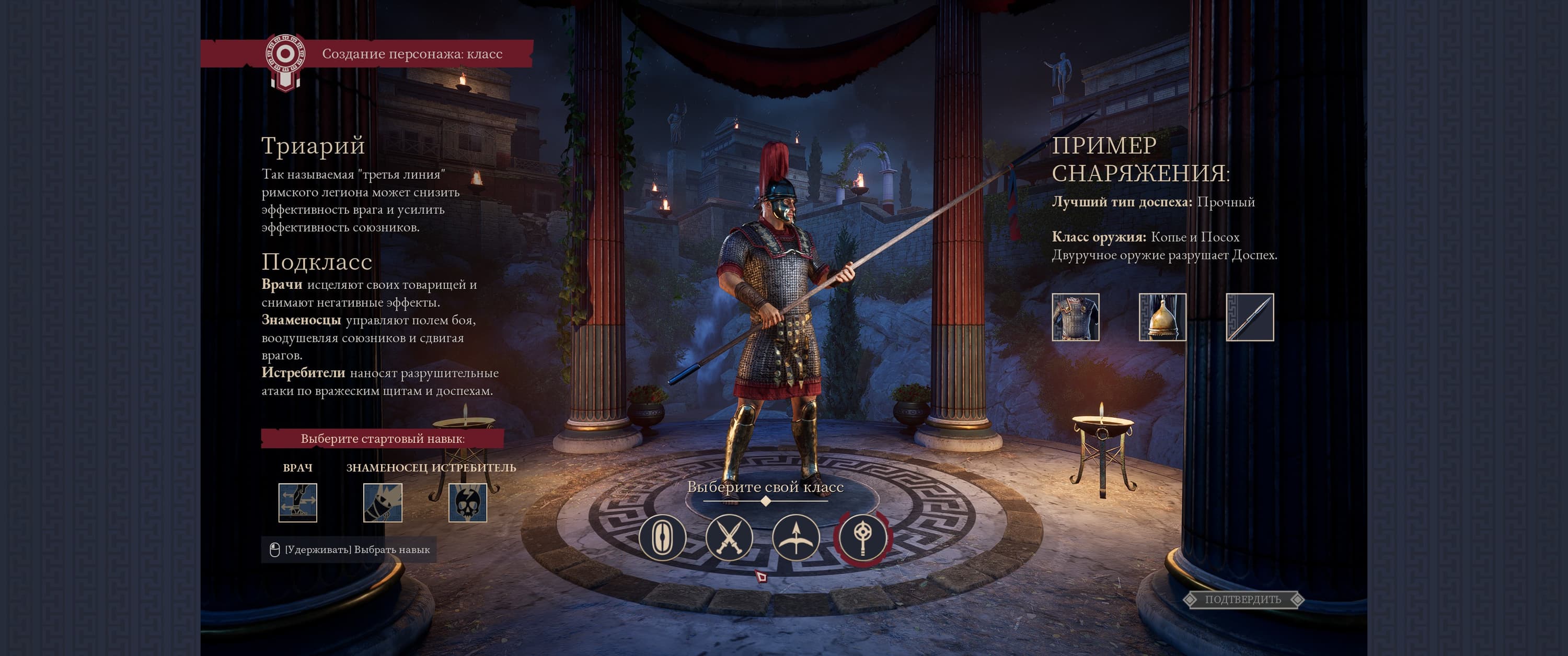 - Триарий – боец в среднем доспехе, вооружен длинным копьем или посохом, чаще всего исполняет обязанности медика;