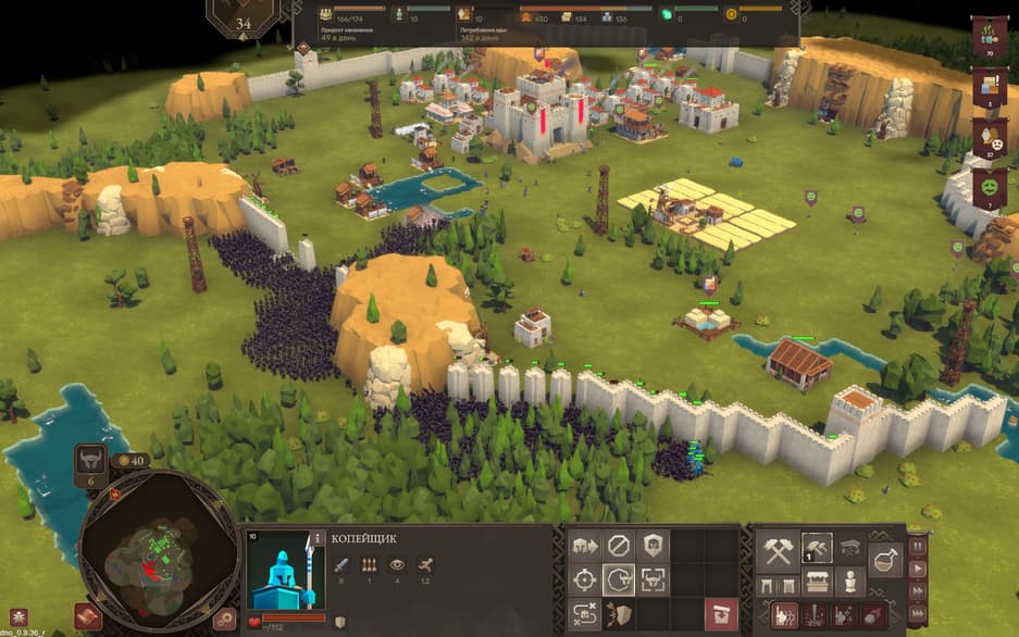 Игрок оказывается в центре случайно сгенерированной карты, где он должен начать свой путь к процветанию. Вокруг него – толпы бунтующих крестьян. Они тоже строят целые сети сооружений, вооружены катапультами и вообще здраво дают отпор. Зачищать карту придётся, иначе на последней волне вся эта толпа придёт к вам под стены – лучше уж вычищать её постепенно.