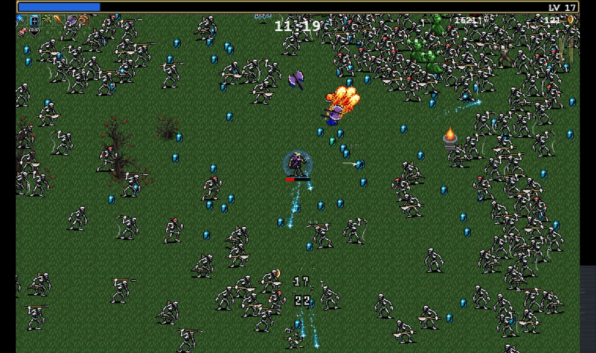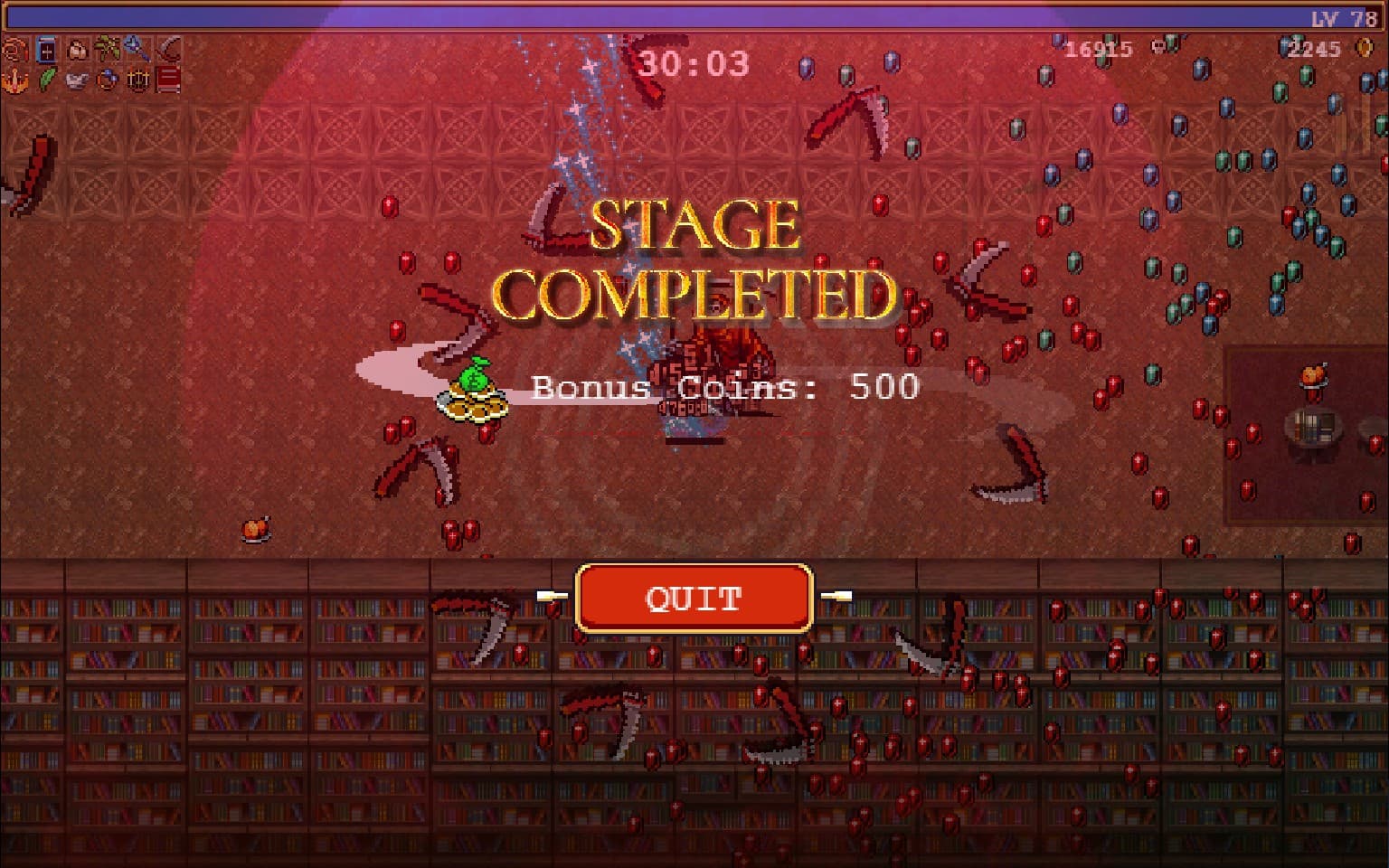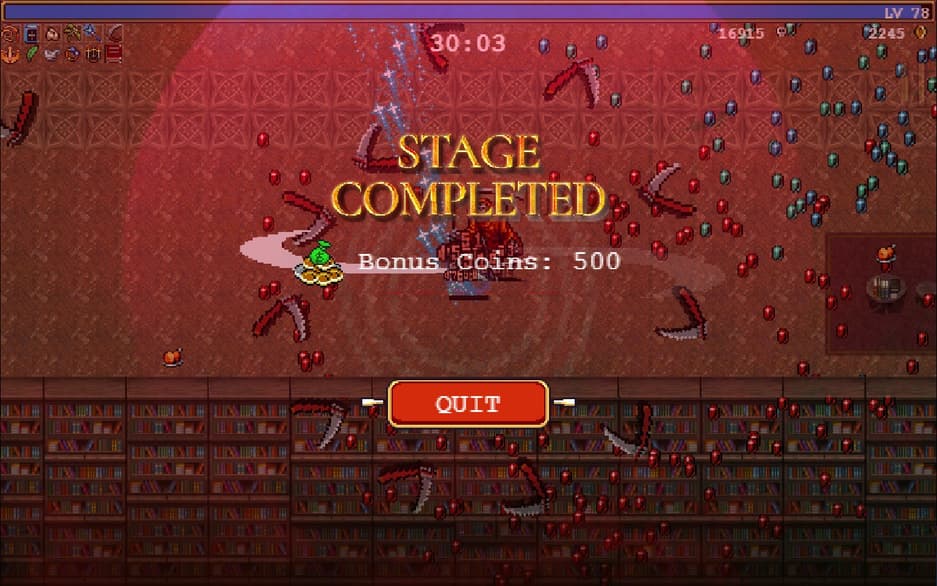 Потренировавшись на первой карте и придя на второй уровень, удалось его пройти с первого раза – просто потому что я уже знал, что связка «кнут-книжка-чеснок-топоры» работает всегда и везде. Прокачав область поражения и урон, я убрал руку с клавиатуры и просто смотрел на экран, иногда клацая кнопку «Пробела» для выбора новых предметов за полученный уровень. А затем все враги в один момент исчезли, прилетел босс «Смерть» и убил героя с одного удара – игра выдала победное «Stage Complete».