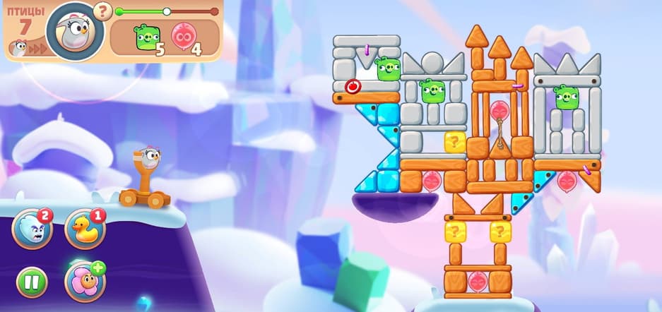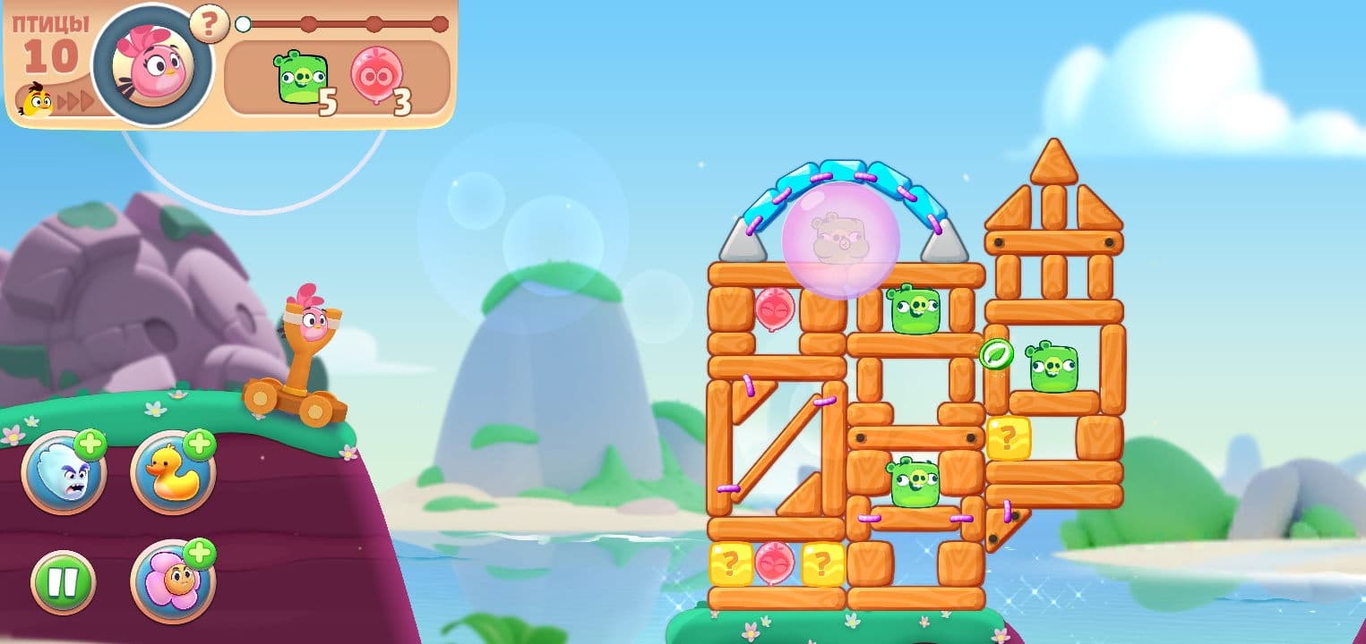 Зеленые свинки, как и в классической игре, прячут трофеи и тушки в баррикадах из стеклянных, деревянных, оловянн… каменных, желейных, блоков, огораживаются цепями и механизмами, используют рельеф местности. В общем, пытаются усложнить жизнь птичкам, как только можно. Количество птиц, доступное на уровне, не бесконечное, а построек от трех до пяти. Так что приходится искать слабые места и грамотно использовать способности персонажей, чтобы освободить птенцов и свиней наказать.