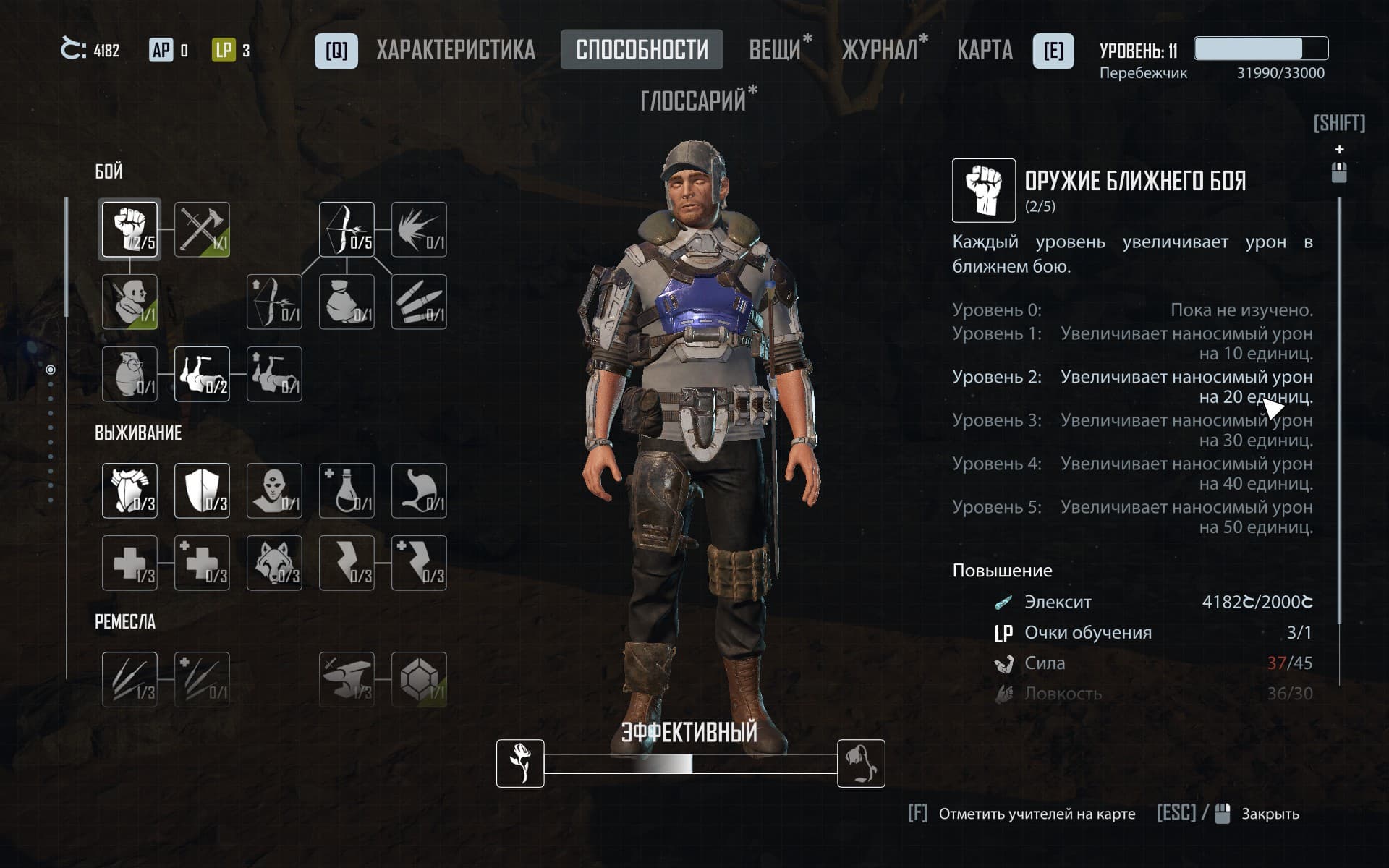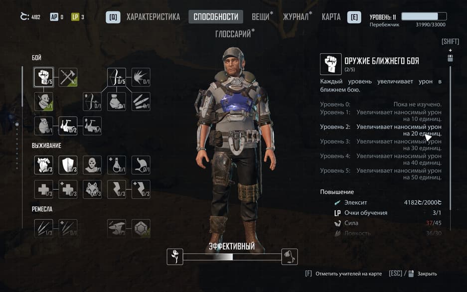 Прокачка персонажа никак не изменилась: вкладывая очки характеристик, игрок получает возможность с помощью очков навыков обучаться у других персонажей. Механика, известная со времён первой «Готики». Только в этот раз её попытались сделать более универсальной, и это была ошибка. Хочешь использовать крутое энергетическое оружие в будущем? Качай заранее интеллект и ловкость, а на остальное забей. Но забить не получается. Другие характеристики нужны для других, таких же важных навыков, вроде повышения здоровья, кузнечного дела и прочего – вот и получается к финалу «на все руки» герой.