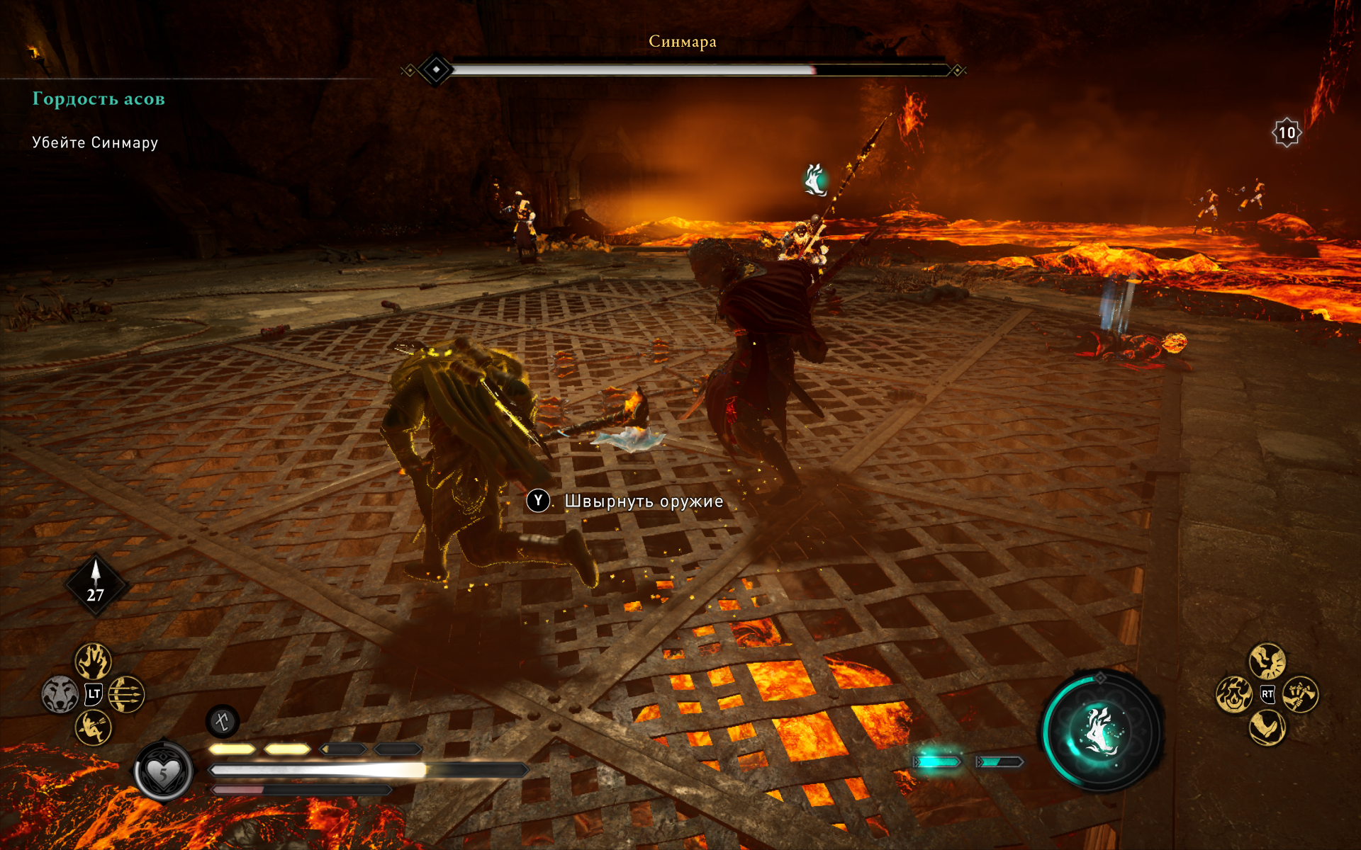 Браслет Хуг позволяет поглощать способности врагов. Всего их пять: превращение в огненного турса, ледяного ётуна, в ворона, воскрешение мёртвых врагов и привлечение их на свою сторону, а также телепортация с помощью лука. Иметь одновременно можно две способности – остальные можно поглотить с павших противников. На бумаге все эти навыки звучат круто, тем более что у них есть прокачка. Но по сюжету пользоваться нужно только одной из них – превращением в жителя Муспельхейма. Всё!