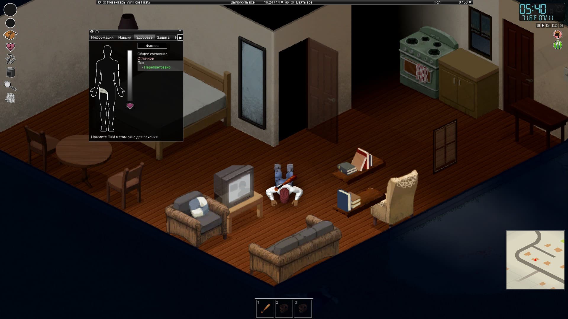 Выжившего надо держать сытым, здоровым и отдохнувшим. Нельзя его сильно нагружать, иначе начнет уменьшаться здоровье. Если отправить его биться с зомби уставшим и голодным, то много он не навоюет. Он подвержен паническим атакам, которые заставят его оступиться в самый неподходящий момент. А еще он заскучает, если не будет ничего делать. Развлекайте его!