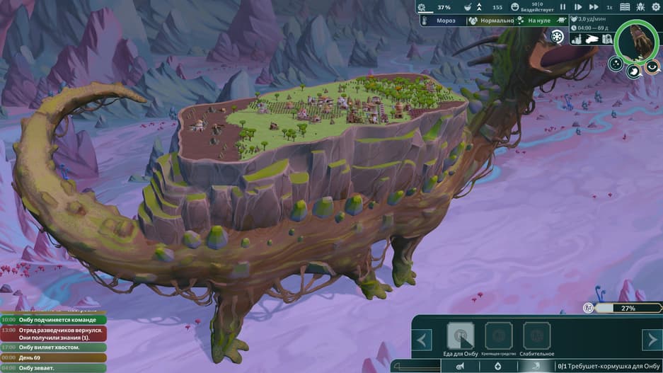 Но доверие зверя придётся заслужить! Динозавтра надо кормить, запуская грибы из требушета в гигантскую пасть. Если Онбу заболевает, то отправьте докторов на воздушном шаре, чтобы ввести лекарство. Со временем выжившие научатся гладить чудовища и это выглядит мило! Довольный Онбу будет вилять хвостом.