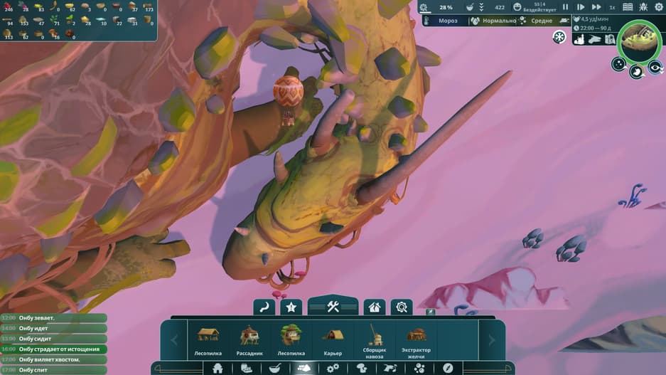 Рабочих рук будет не хватать. Надо постоянно снимать работников с неиспользуемых зданий, и направлять их на нужные направления — добычу и перенос ресурсов, уничтожение ядовитых наростов или восстановление поврежденных зданий.