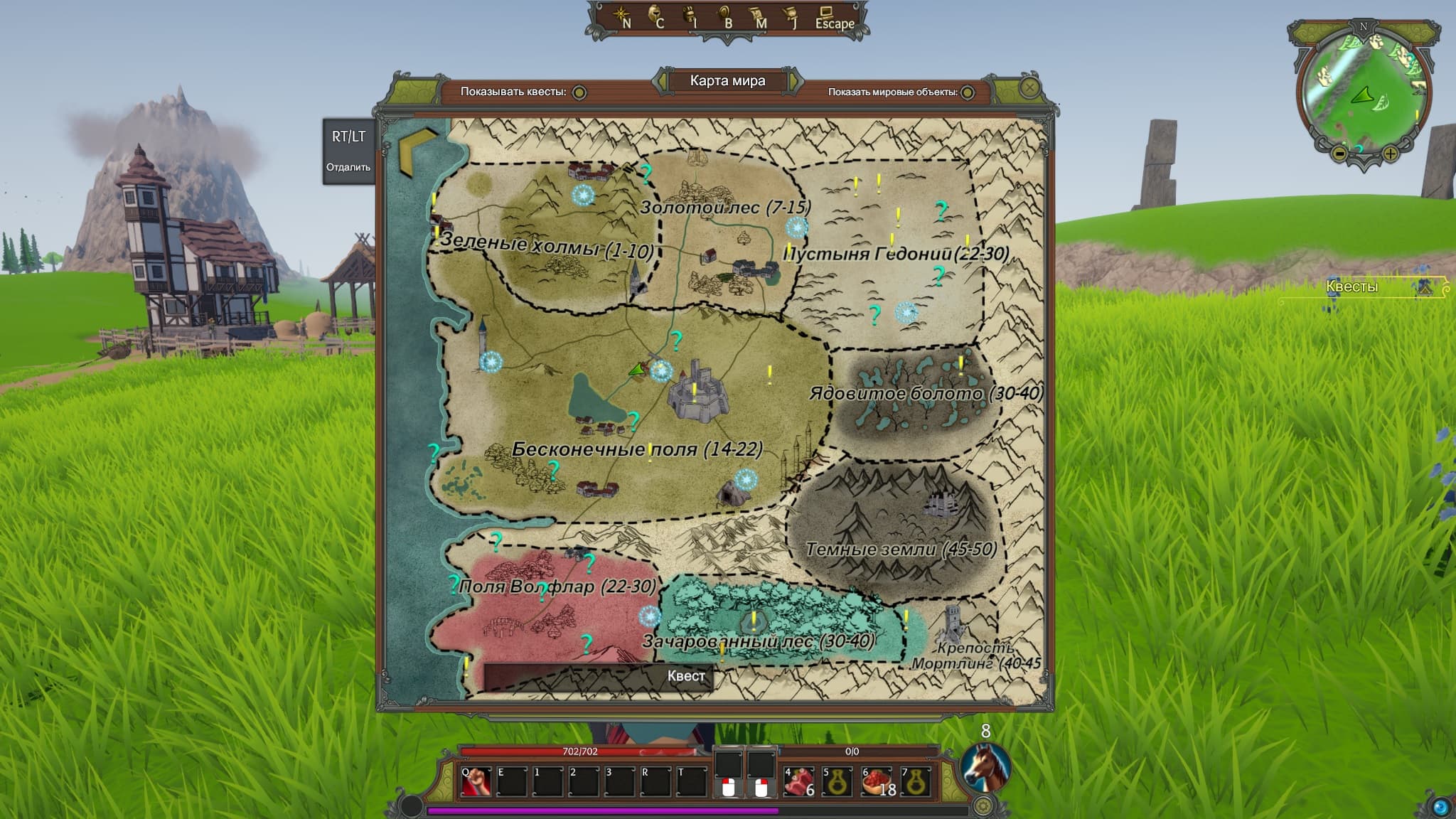 Разнообразных биомов хватает: поля, засеянные пшеницей и картофелем; лесистые местности с волками и медведями; пустыня со скорпионами; болота с крокодилами; несколько городов, включая один крупный; подземелья и пещеры с нежитью и другими тварями. Правда, огромные участки земель пустуют или заполнены горами, что делает исследования нудноватыми, заставляя искать редкие скопления скучающих мобов в надежде подзаработать опыта. Зато на карте легко найти точки интересов: отдельно выделяется продолжение истории, необязательные задания, тайны, гладиаторская арена, мировые боссы и даже мировые события в стиле «собери-убей-наруби».