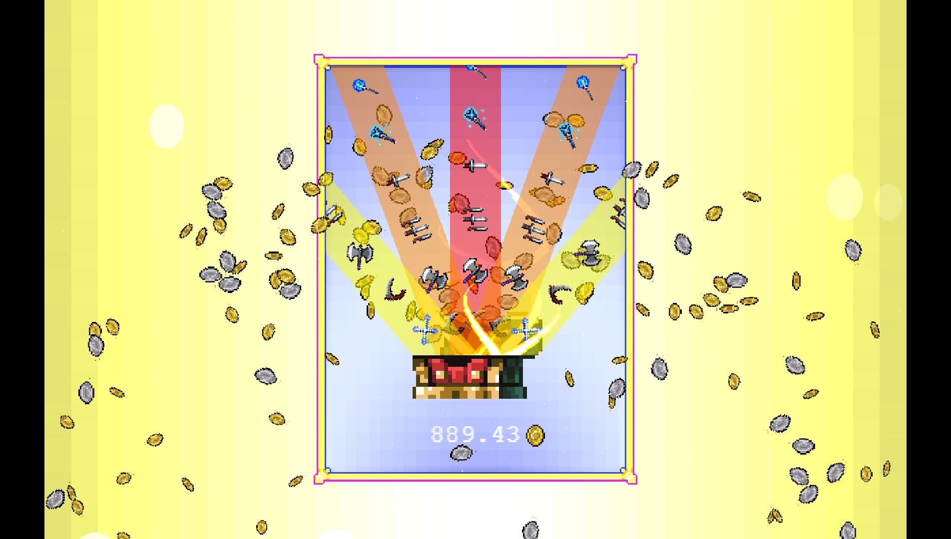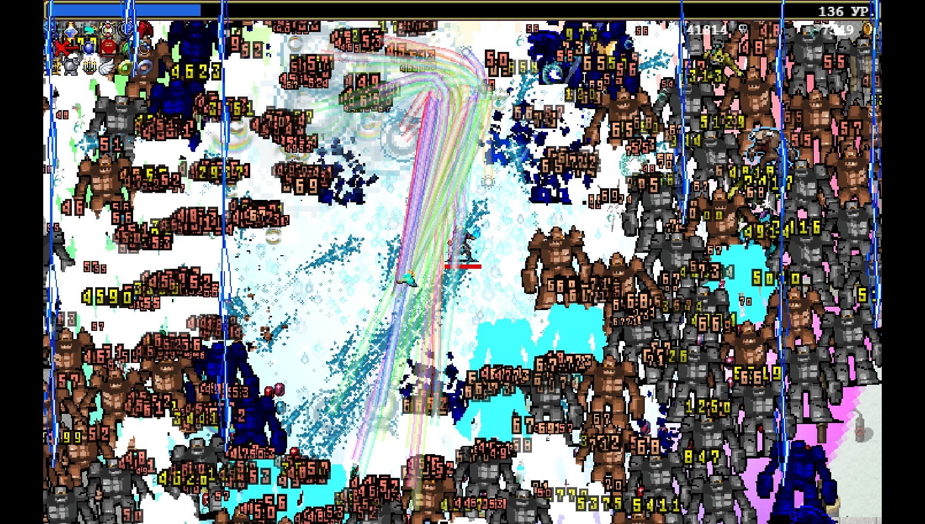 В хаосе участвует и оружие — с каждым уровнем эффекты становятся ярче и больше. Со временем экран будет покрыт молниями, светящимися лужами, топорами и радужными снарядами. При этом производительность игры не проседает!
