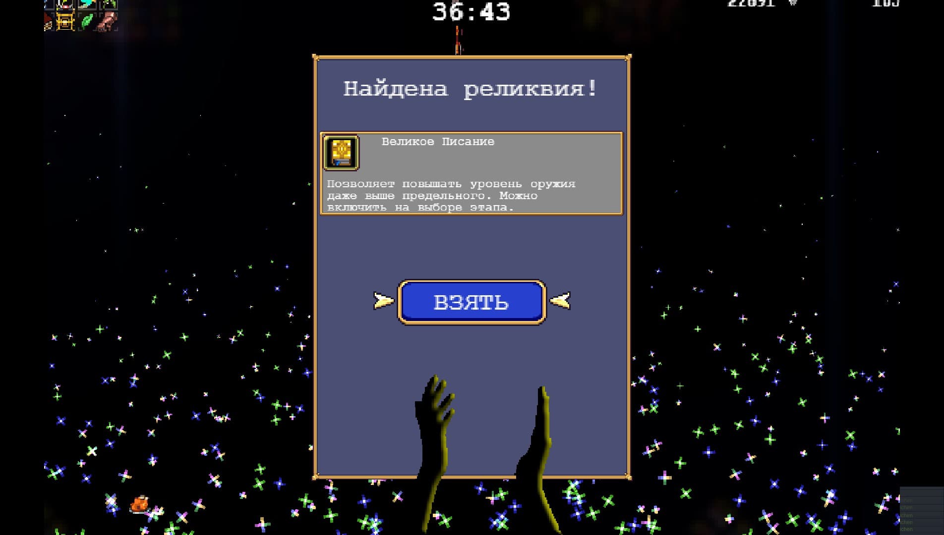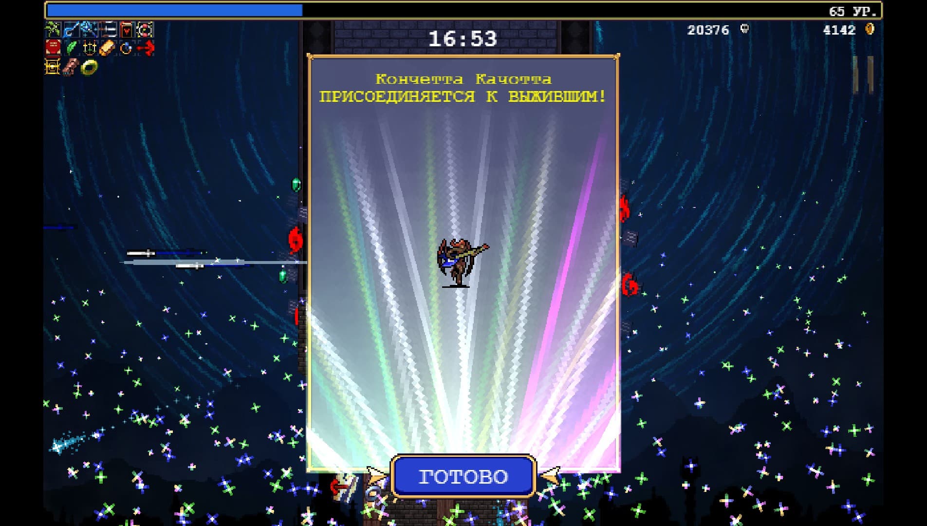 Со временем на это перестаешь обращать внимание. Ведь даже The Binding of Isaac заимствовал из Catlevania и The Legend of Zelda. Главное – как Vampire Survivors использует украденные модельки. Хоть на игрока и прет орда монстров, в хаосе не теряешься — ту же указывающую на сундук стрелку видно даже если экран заполонили враги.