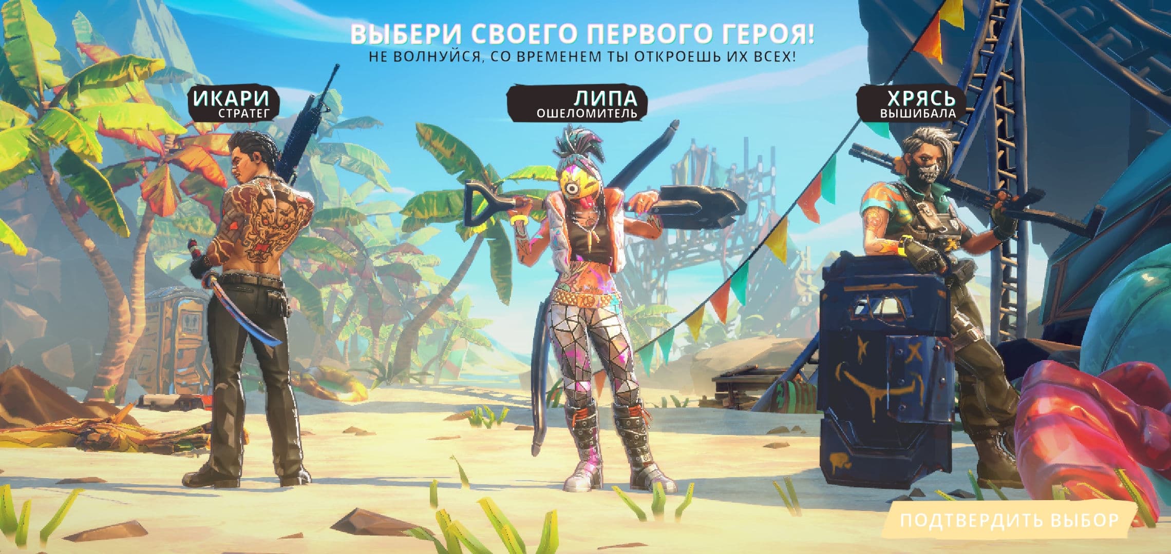 Игрок на начальном этапе выбирает себе первую уникальную снежинку, с которой ему предстоит эту свободу обретать. Выбор персонажей на релизе небогат, но выбирать не хочется вообще. По заветам эффективного менеджмента, все герои раскрашены как попугаи, внешне максимально инклюзивны и разнообразны, а не вызывают никакой симпатии. Когда-то одного взгляда на Джокера из вселенной DC хватало, чтобы понять — вот он, настоящий психопат. Глядя же на героев Wild Arena Survivors, которые должны залить кровью необитаемый остров, понимаешь — не Джокеры, а клоуны.