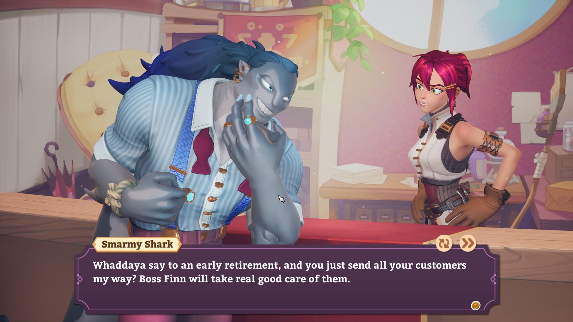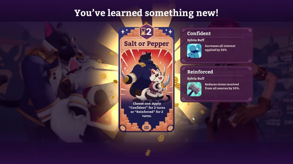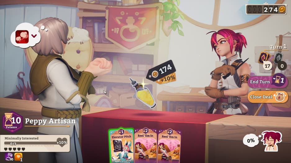 В этот момент начинается битва между продавцом и покупателем. Ваши приемы предстают в виде карт. Используя их, игрок повышает интерес клиента, поддерживает его и защищаетесь от колкостей. Одни карты работают в связке, усиливая друг друга. Другие накладывают эффекты, которые делают аргументы героини убедительнее.