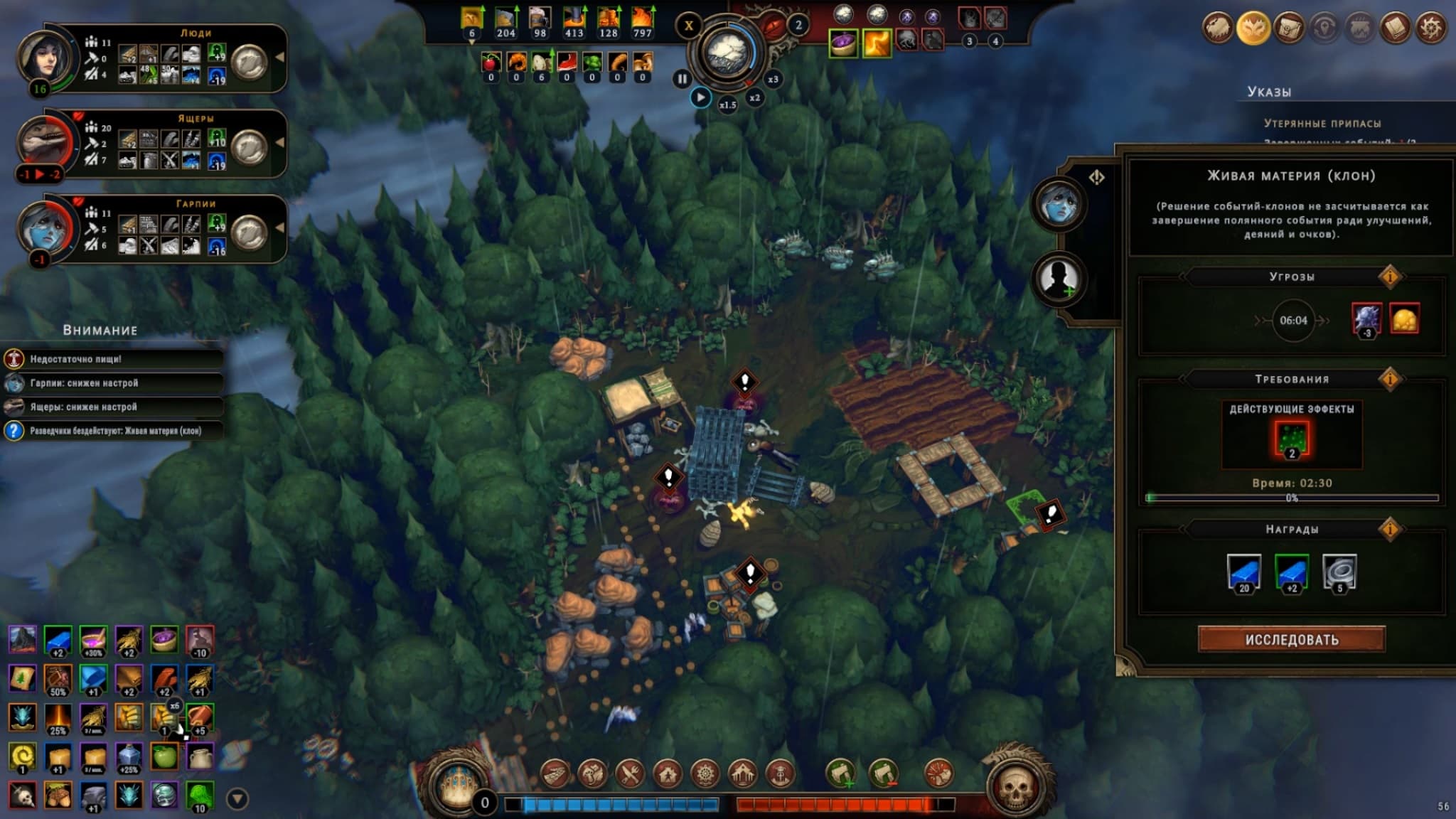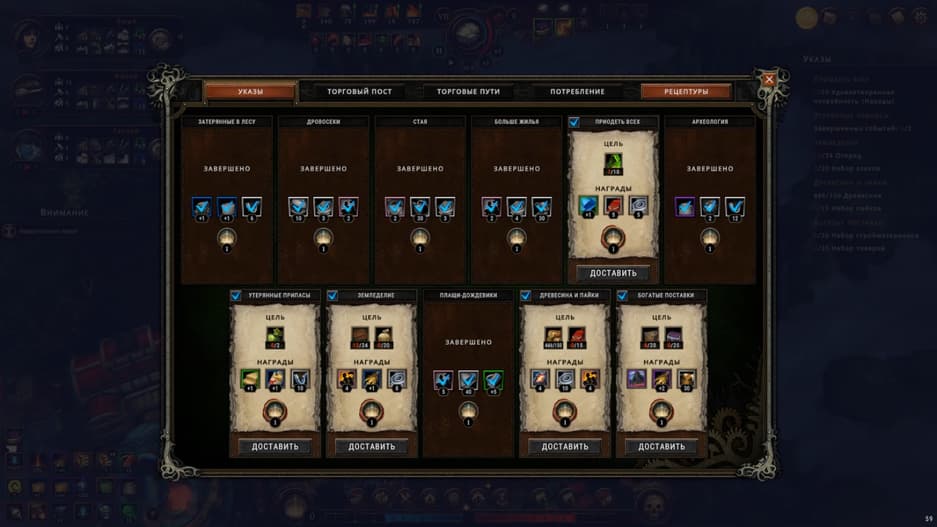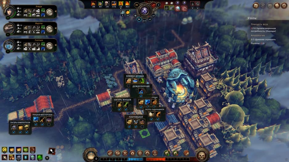 Вторым компонентом «рогалика» традиционно выступает случайность. Случайные модификаторы (краевые камни), указы королевы, выдаваемые здания, товары у торговца, предметы на полянах и другое. Но Against the Storm, не просто какая-то «игра со случайностью» – обычно партия превращается в своеобразную головоломку, где игрок должен проявить смекалку, чтобы выйти из любой ситуации победителем. И обычно это реально. Ну и, конечно, удача будет не лишней.